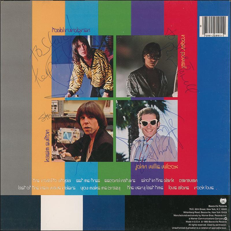Adventures in Utopia album signed and inscribed in ballpoint on the back cover by Todd Rundgren, Roger Powell, Kasim Sulton, and John Wilcox. In fine condition, with a bit of scattered light cover wear, and light contrast to Sulton’s signature. The record is not included. RRAuction COA.