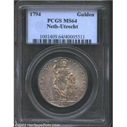 Utrecht. Gulden 1794, KM102, MS64 PCGS. An extremely attractive coin with medium gray toning. Important notice: We expect to be auctioning lots at the rate of 200-250 per hour. Sometimes eBay Premier live bid software cannot keep up with that pace, so we strongly recommend that you place a realistic proxy bid now as insurance to avoid disappointment. Also please note that all Heritage/CAA lots purchased through eBay Premier carry a 20% Buyer's Premium. Please make sure you read the Terms and Conditions.