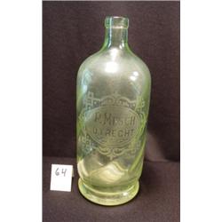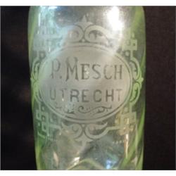 P. Mesch Utrecht Acid etched label Bottle-Paris 10" by 3 1/2" diameter. Vaseline glass w/ribbed swirl and no seams.
