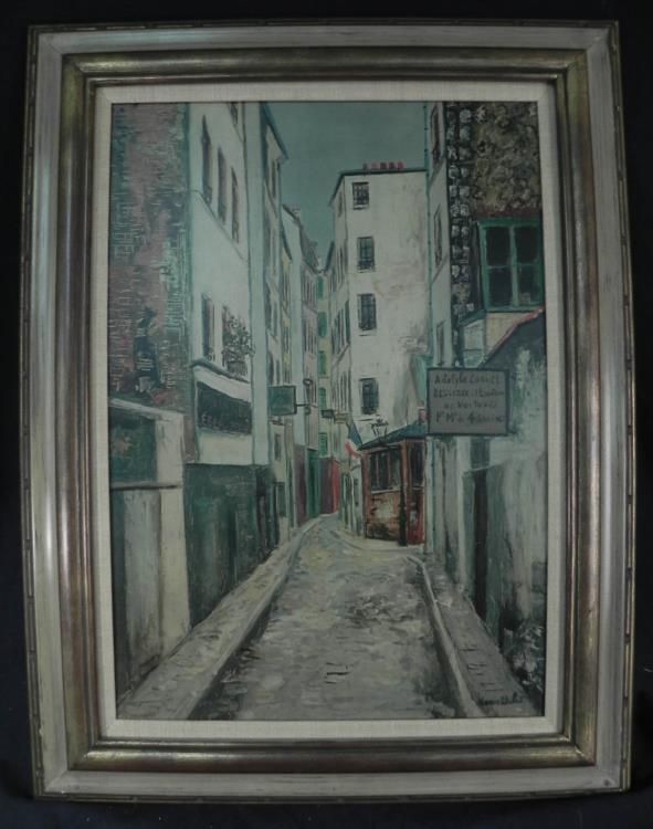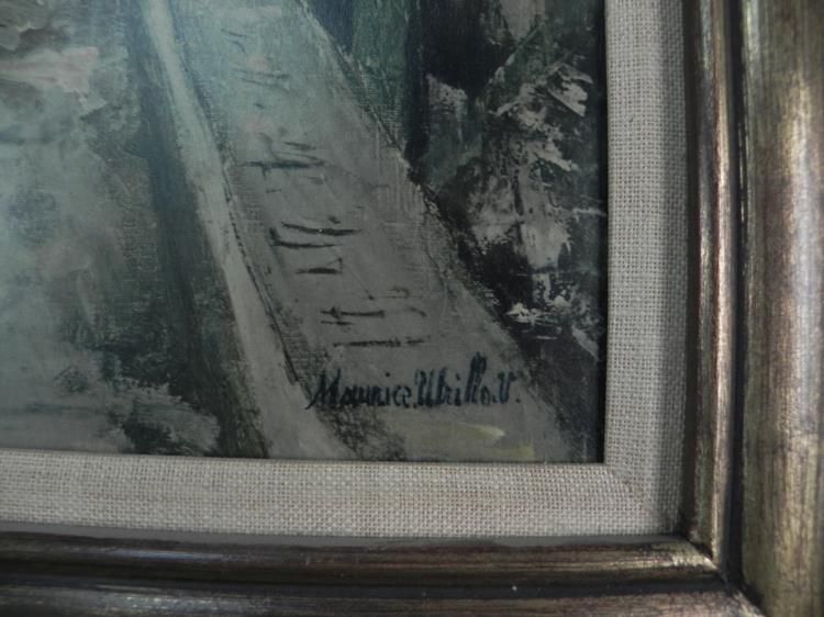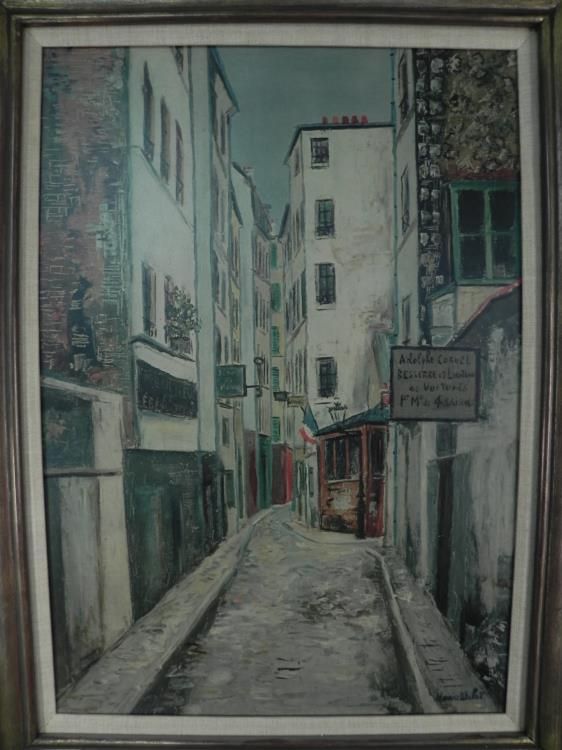 Offered here is an oil on board painting done by Maurice Utrillo .V. This piece is in a wooden framed and shows a city street. ---Artist: Maurice Utrillo -Medium: Oil on Board -Frame: Wooden Frame - Image Size: 23" x 15.5" -Frame Size: 30" x 23" -Condition: Excellent, some scratches and wear on frame