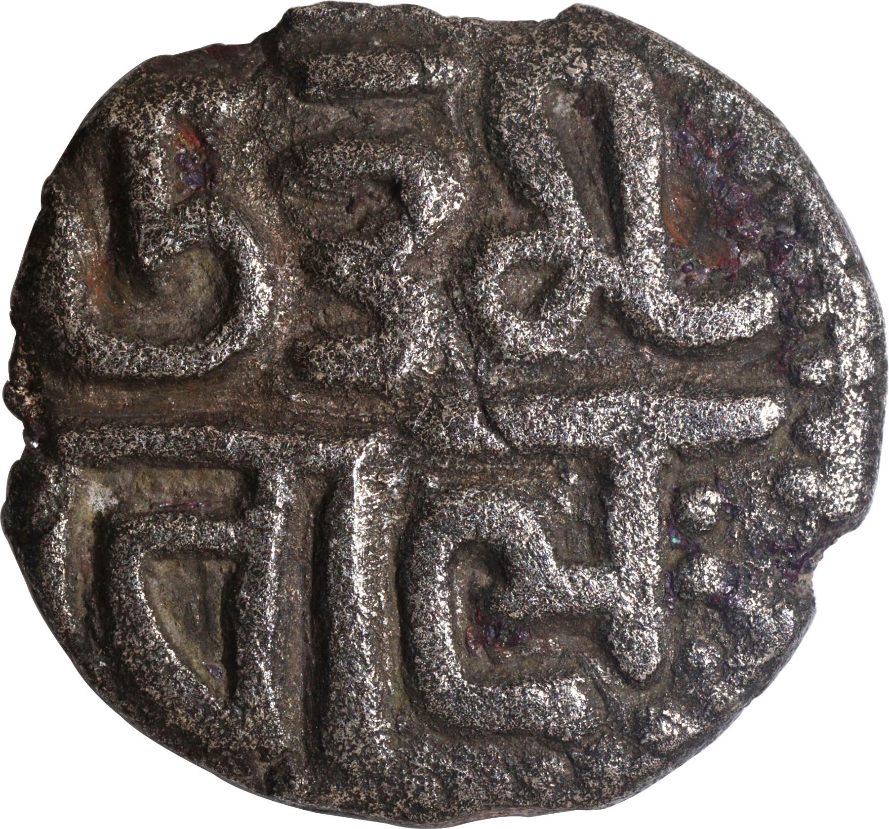 Chola Empire, Uttama Chola (973-985 CE), Base Silver Kahavanu, Obv: the Chola royal insignia, i.e., an umbrella along the center on top flanked by two flywhisks, following figures, from left to right: a lampstand, a strung bow, a tiger (Chola symbol) seated right facing two upright fishes (Pandyan symbol) and another lampstand, Rev: the Nagari legend ‘Uttama Cholah’ in two lines, 3.4g, 17.74mm, (Mitch. T&K # 323-29), partial dotted border on both the sides, about very fine, Rare.