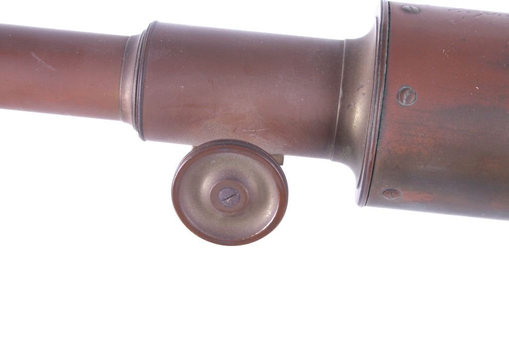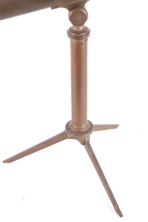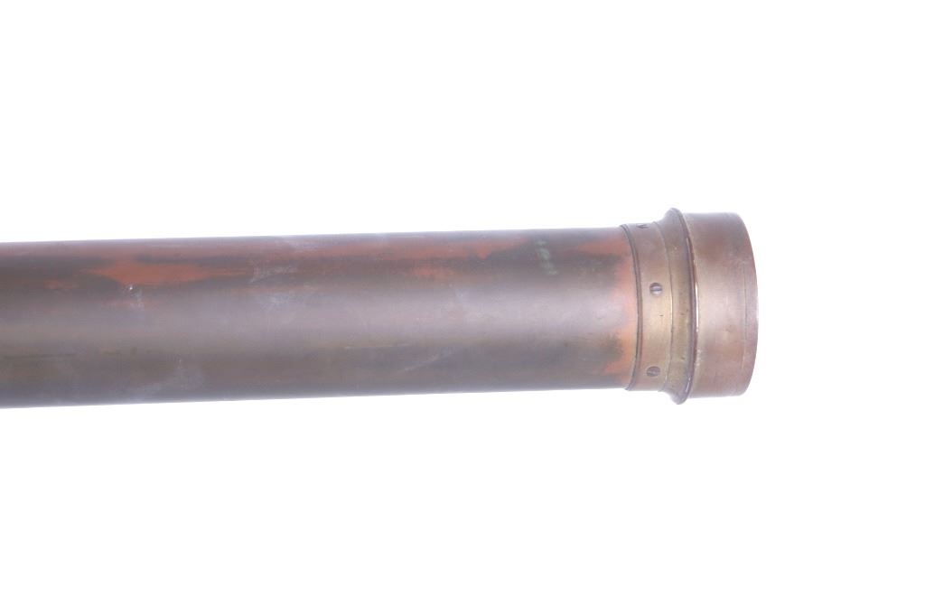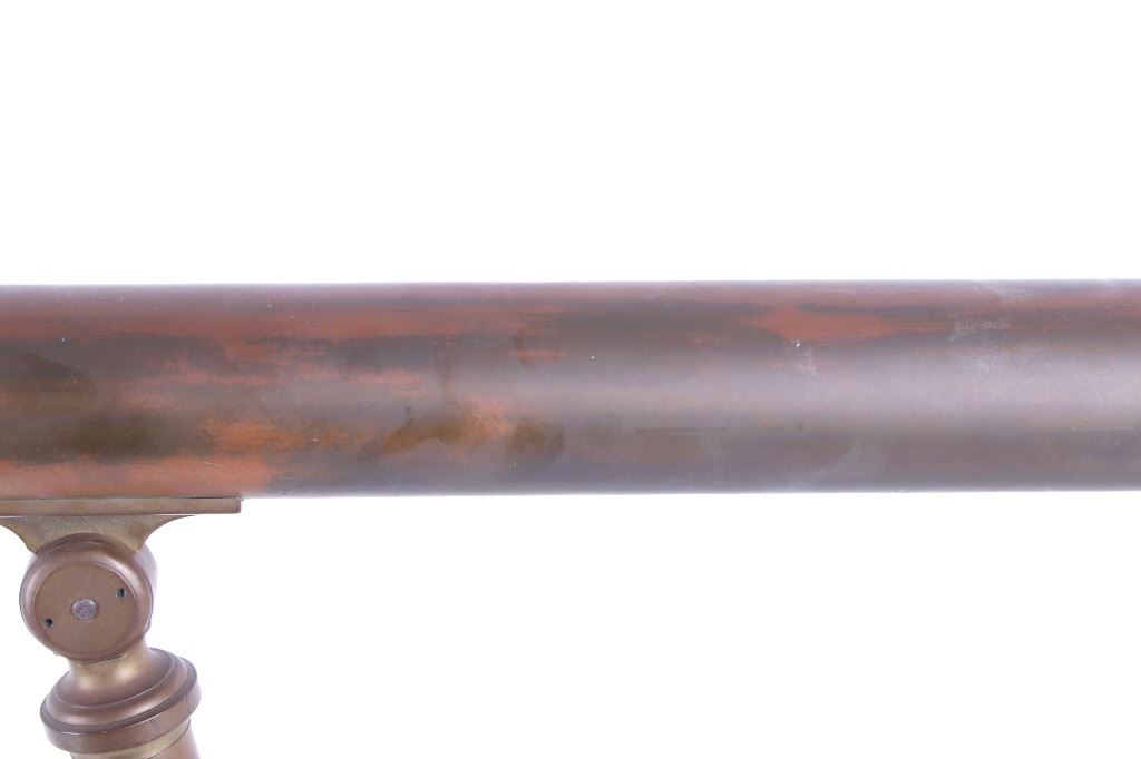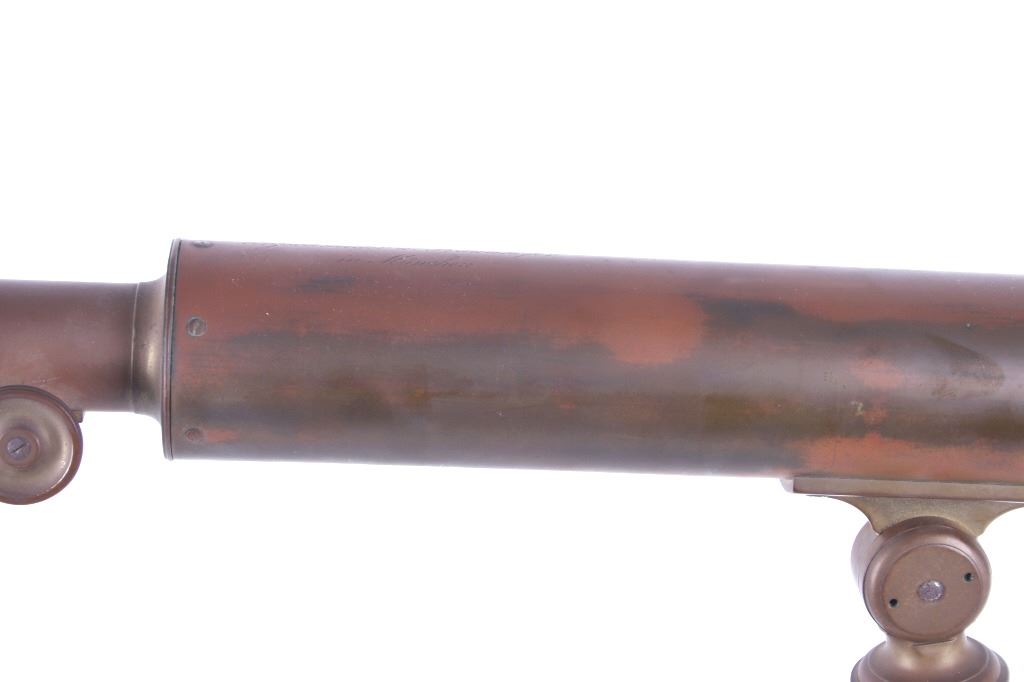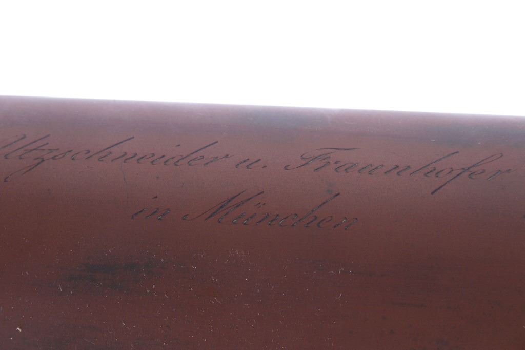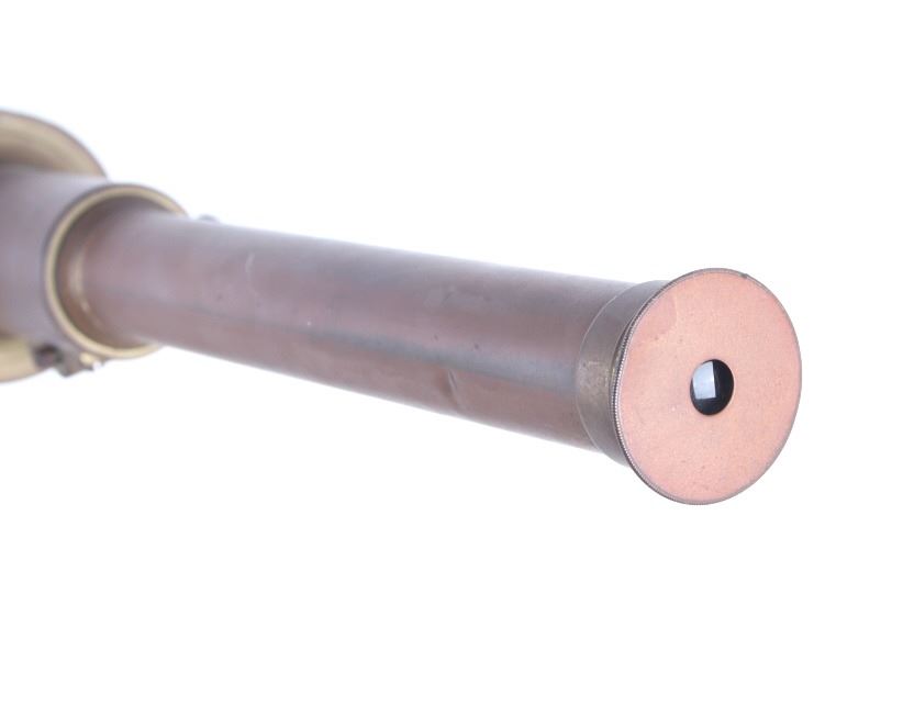 Featured in this lot is this Utzshneider u Fraunfofer brass telescopic sight circa 1840's. The telescope features a wonderfully and professionally crafted brass construction that features a tube sight rail with a adjustable telescopic sight system and is propped up on a tripod system. The tube is marked 'Utzschneider u. Fraunhofer in Munchen' close to the sight system. The condition of this telescopic sight is good with some fading to the sheen of the lacquered brass but otherwise it shows good overall condition. The measurements of this telescopic sight is 21 1/4" x 39" x 14".