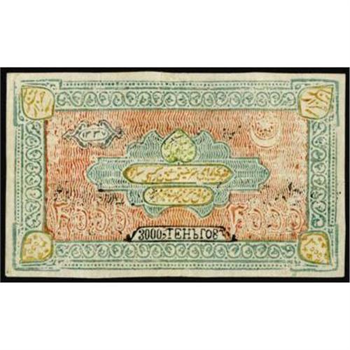<style type="text/css"> body, td, th { font-family: Arial, Helvetica, sans-serif; font-size: 12px; color: #482424; margin: 0px; padding: 0px; } #header { background-image: url(http://www.bowersandmerena.com/ebay/images/template_v3_01.gif); clear: both; background-color: #590303; border-top-width: 2px; border-top-style: solid; border-top-color: #B38C4F; } #header #header_wrapper { height: 75px; clear: both; width: 800px; margin-right: auto; margin-left: auto; background-image: url(http://www.bowersandmerena.com/ebay/images/template_v3_03.gif); background-repeat: no-repeat; background-position: right; color: #F3EDCC; } #header #header_wrapper #header_logo { float: left; height: 75px; width: 444px; background-image: url(http://www.bowersandmerena.com/ebay/images/template_v3_02.gif); background-repeat: no-repeat; font-size: 10px; text-transform: capitalize; color: #B38C4F; } #header #header_wrapper #header_right { float: left; height: 75px; width: 356px; text-align: right; } #header #header_wrapper #header_right #headerLoginBtn { margin-bottom: 30px; } #header #header_wrapper #header_right input#txtSearch { color: #B49056; border: 1px solid #B49056; width: 175px; padding-top: 3px; padding-right: 3px; padding-bottom: 4px; padding-left: 3px; } #nav { height: 37px; background-image: url(http://www.bowersandmerena.com/ebay/images/template_v3_05.gif); clear: both; } #nav #nav_wrapper { height: 35px; width: 800px; margin-right: auto; margin-left: auto; border-left-width: 1px; border-left-style: solid; border-left-color: #B38C4F; } #nav #nav_wrapper a { padding-right: 15px; padding-left: 15px; border-right-width: 1px; border-right-style: solid; border-right-color: #B38C4F; height: 25px; padding-top: 10px; display: block; float: left; text-decoration: none; font-weight: bold; color: #5D0303; } #nav #nav_wrapper a:hover { color: #B38C4F; } #nav #nav_wrapper #search { float: right; padding-top: 7px; } #nav #nav_wrapper #search #txtSearch { font-family: Arial, Helvetica, sans-serif; font-size: 10px; text-transform: uppercase; color: #D2AE75; border: 1px solid #B38C4F; padding: 3px; } #content_bgd { background-image: url(http://www.bowersandmerena.com/ebay/images/template_v3_09.gif); background-repeat: repeat-y; background-position: center; padding-top: 15px; padding-bottom: 15px; background-color: #FBFBDB; } #content_wrapper { clear: both; height: auto; width: 800px; margin-right: auto; margin-left: auto; } .LotDetailWhite { line-height:normal; font-size:13px; font-family: arial,helvetica,sans-serif; color: White; font-weight: bold; } .LotDetailInformation { line-height:normal; font-size: 13px; font-family: arial,helvetica,sans-serif; } .LotDetailMessage { line-height:normal; font-size: 13px; font-family: arial,helvetica,sans-serif; color: red; } } tr.HeaderAuctionTitle td { color: #000000; font-weight: bold; padding: 2px; background-image: url(http://www.bowersandmerena.com/ebay/images/template_v3_05.gif); background-repeat: repeat-x; border-bottom-width: 1px; border-bottom-style: solid; border-bottom-color: #B38C4F; } table.AuctionSummary a, table.AuctionSummary a:link, table.AuctionSummary a:visited { color: #0000FF; text-decoration: none; } } td.tableHeaderLeft { border-left-width: 1px; border-left-style: solid; border-left-color: #B38C4F; } td.tableHeaderRight { border-right-width: 1px; border-right-style: solid; border-right-color: #B38C4F; } td.tableCellMiddle { border-left-width: 1px; border-left-style: solid; border-left-color: #B38C4F; border-right-width: 1px; border-right-style: solid; border-right-color: #B38C4F; padding: 5px; } tr.footer td { border-top-width: 1px; border-top-style: solid; border-top-color: #B38C4F; } </style> </head> <body> <div id="header"> <div id="header_wrapper"> <div id="header_logo"> </div> <div id="header_right"> </div> </div> </div> <div id="nav"> <div id="nav_wrapper"> <a href="http://www.bowersandmerena.com">Our eBayLive Auctions</a> <a href="#PaymentInfo">Payment Information</a> <a href="#ShippingInfo">Shipping Information</a> <a href="#About">About Bowers and Merena</a> </div> </div> <div id="content_bgd"> <div id="content_wrapper"> <table width="100%" border="0" cellpadding="5" cellspacing="0" class="AuctionSummary"> <tbody> <tr class="HeaderAuctionTitle" style="height: 25px;"> <td align="left" class="tableHeaderLeft" > </td> <td align="center" class="tableHeaderRight"> <span style="font-size: large;">Lot #2376. Uzbekistan. Bukhara, Emirate, Treasury, 1918 Second Issue.</span> </td> </tr> <tr> <td colspan="3" class="tableCellMiddle"> AH1337 (1918), 3000 Tengas, P-17a, turquoise frame, XF+ to AU condition. Rare in high grade.