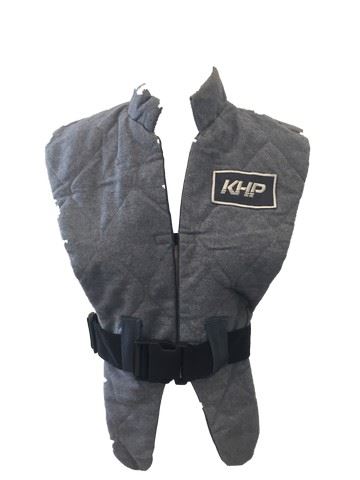 V-(1983) grey vest with black belt buckle, patch on left of chest "KHP".