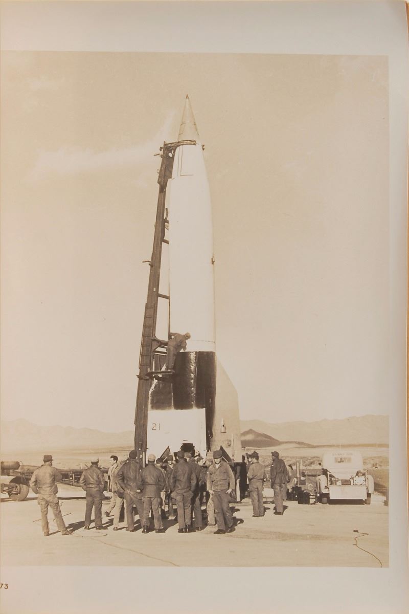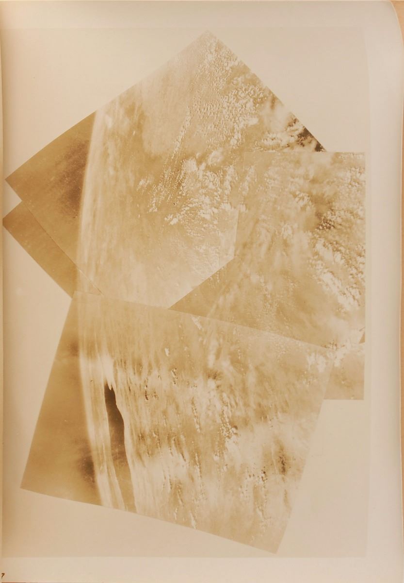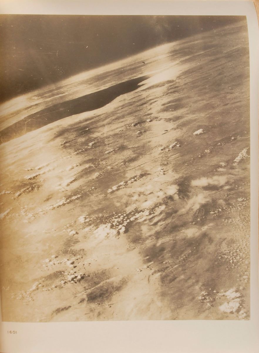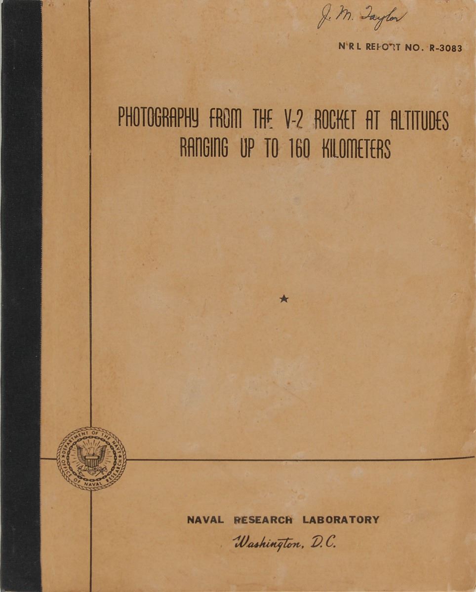 Exceedingly rare book containing the first published photographs of the Earth taken from space: a report entitled “Photography from the V-2 Rocket at Altitudes Ranging up to 160 Kilometers” by T. A. Bergstrahl [NRL Report No. R-3083]. First edition. Washington, DC: Naval Research Laboratory, 1947. Softcover, 8.5 x 10, 25 pages. According to the distribution list in the beginning, only 47 of these reports were produced. It contains 12 original glossy photographs with interleaved captions, one of which shows V-2 rocket #21 prepared for launch at the Army Ordnance Proving Ground at White Sands, New Mexico. The other eleven photographs show views of Earth captured by a camera attached to the rocket, taken at altitudes of 225 meters to 162 kilometers. Especially notable are the last three photographs, in which the curvature of Earth is easily seen; the final photograph is a composite of images covering approximately 500,000 square miles of the southeast United States and northern Mexico. In very good condition, with scattered scuffing to covers and general handling wear.