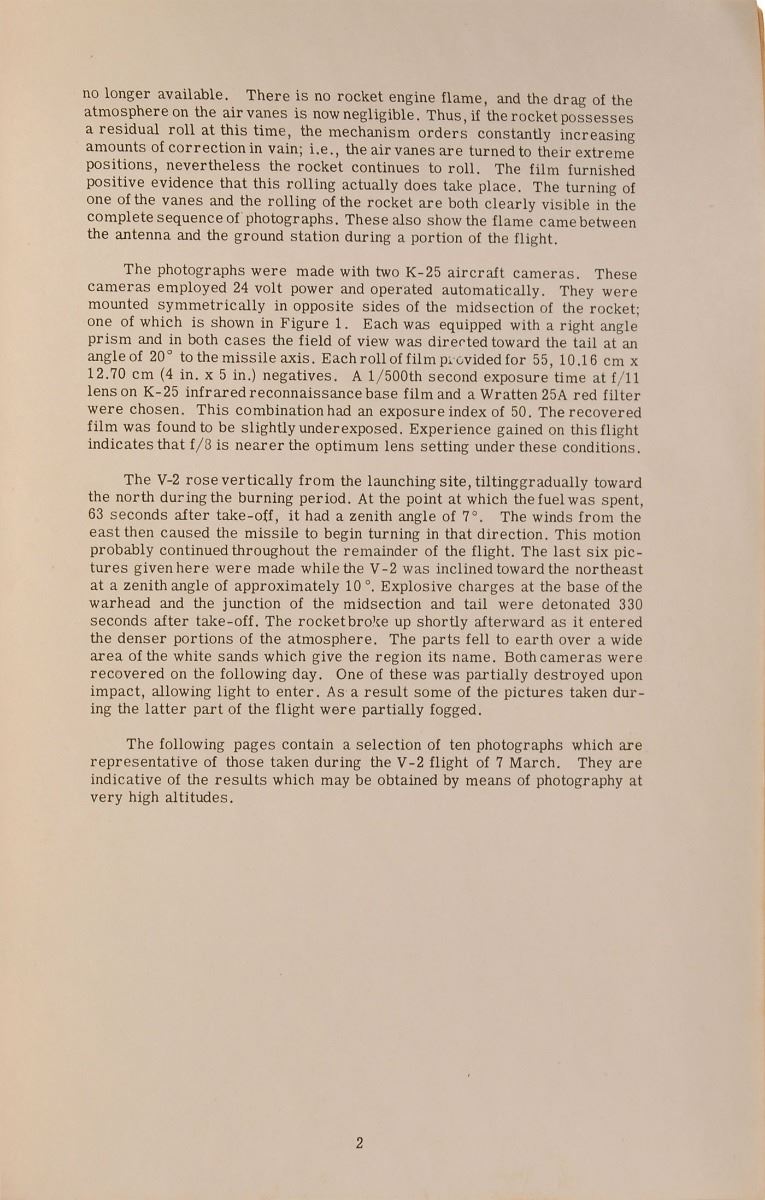 Although the V-2 research team was able to obtain photographs of Earth from 65 miles above the surface, they were not published until 1950 (perhaps due to their low quality). The images in this report, taken on March 7, 1947, were the first ever to be taken from altitudes greater than 100 miles (160 kilometers) as well as the first to be published. An exceptionally rare report of great historic importance.