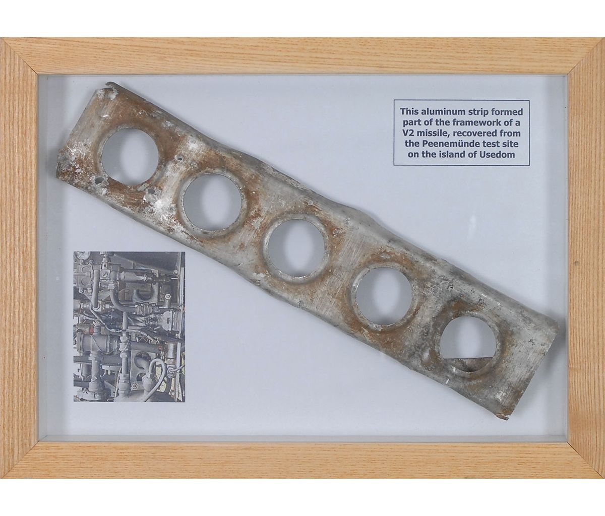 World War II–era aluminum support truss from part of the framework of a German V-2 rocket, approximately 11 x 2.25 x .75, recovered from the Peenemünde test site on the Baltic island of Usedom. Housed in a shadowbox to an overall size of 13 x 9.5. Expected bends, cracks, and charring, otherwise fine condition.