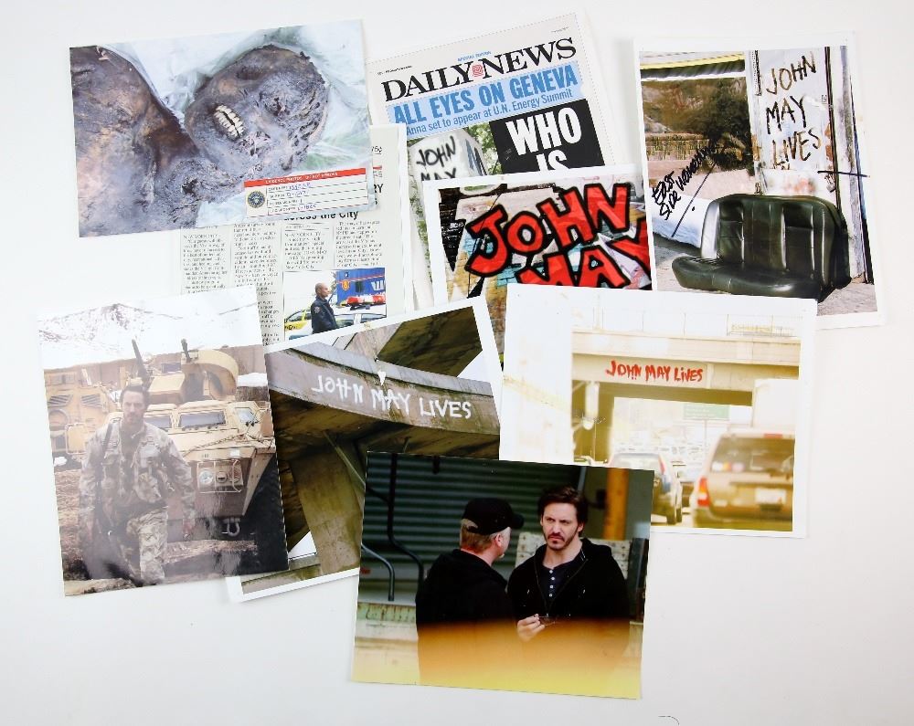 V (American sci-fi series, 2009-2011) - Graphic police photograph of an alien skeleton, two surveillance photos of Hobbes in army fatigues and meeting with a contact and John May lives police photos, all with certificates of authenticity..