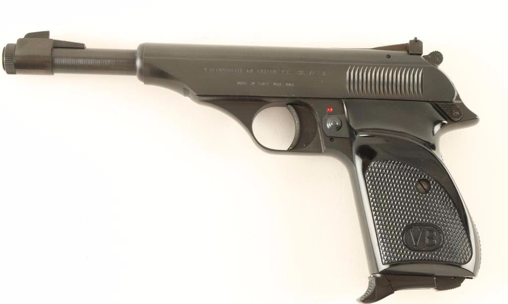 Italian made semi automatic pistol chambered in .22 Long Rifle. Imported by Magnum Research of Minneapolis, Minnesota with import marks on the right side of the slide. Features a blued finish, 6" threaded barrel, ramped front sight, adjustable rear sight, serrated trigger, thumb safety, round serrated hammer spur, 10 round magazine, and black checkered plastic thumb rest grips. Pistol shows little wear with minor imperfections underneath the finish on the slide. Safety does not lock securely and can switch positions if the pistol is jarred. Action is smooth, bore is excellent and grips are fine. Condition is near excellent. ***Modern Firearm***
