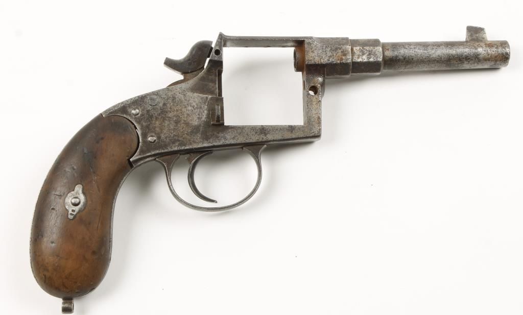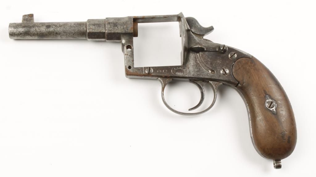 German single action revolver with a safety lever. The hammer spur is broken. There is no cylinder, cylinder pin, pin retainer button or loading gate. The bore is dark with plenty of rifling. Metal is mottled by wear to gray with some light pitting and a little surface rust. All visible numbers match. Unit marked twice on backstrap (one was Xed out). First is "B.l.M.7.59" and the second is "B.l.M.5.42". Condition is fair.