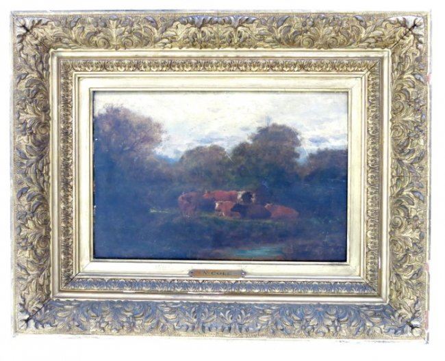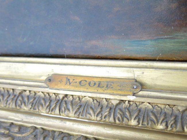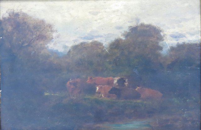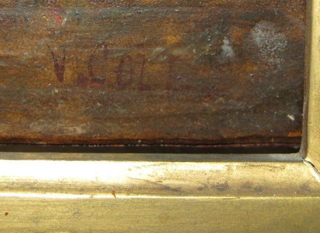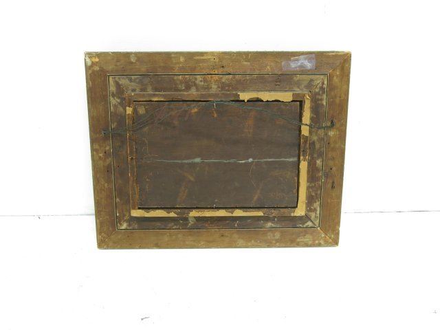 Oil on board. Framed. Signed lower right. Approx. 9.5" x 13.5" without frame, 17" x 21" with frame. Restorations.