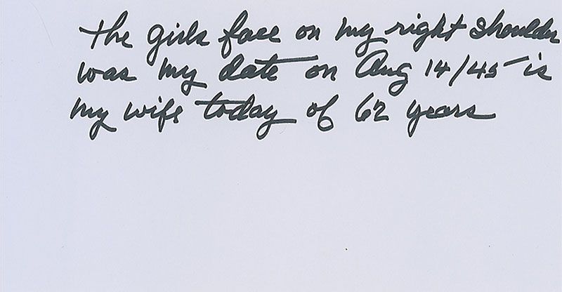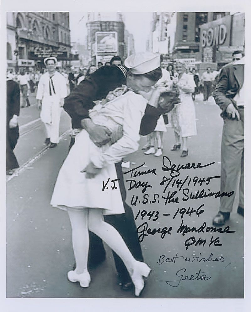 Iconic 8.5 x 11 laser print photo of the famed V–J Day Times Square kiss, signed in black felt tip, “Times Square V. J. Day 8/14/1945, U.S.S. The Sullivans 1943–1946, George Mendonsa QM 1/c,” and “Best wishes, Greta.” Also included is a brief unsigned autograph note from Mendonsa, which reads: “The girls face on my right shoulder was my date on Aug 14/45—is my wife today of 62 years.” In fine condition.