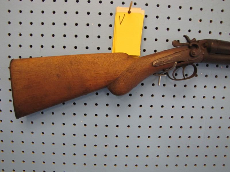 V... J Manton and Company 12 gauge exposed hammers double barrel break open Damascus barrels stock cracked