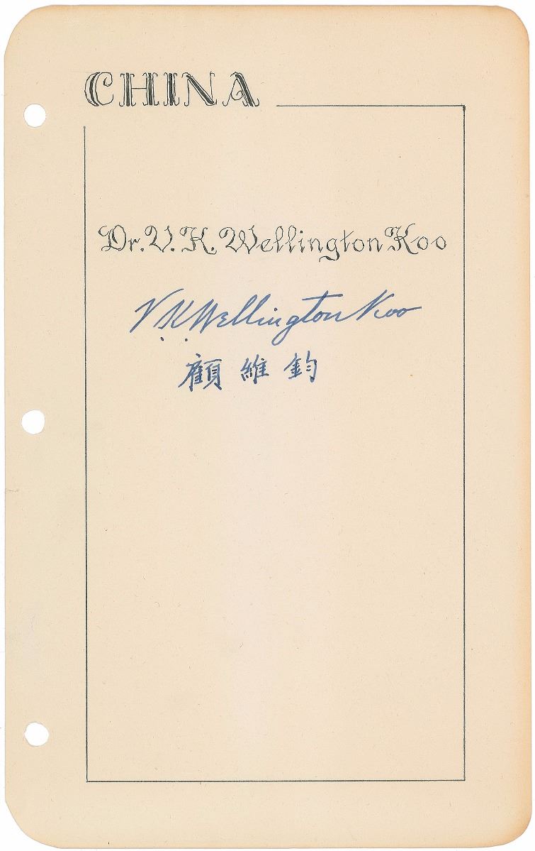 Chinese diplomat (1888–1985) who was one of China's representatives at the Paris Peace Conference of 1919 and served as ambassador to France, Great Britain, and the United States. Fountain pen signature in English and Chinese, “V. K. Wellington Koo,” on an off-white 6 x 9.5 sheet hand-embellished with a calligraphic title. In fine condition.