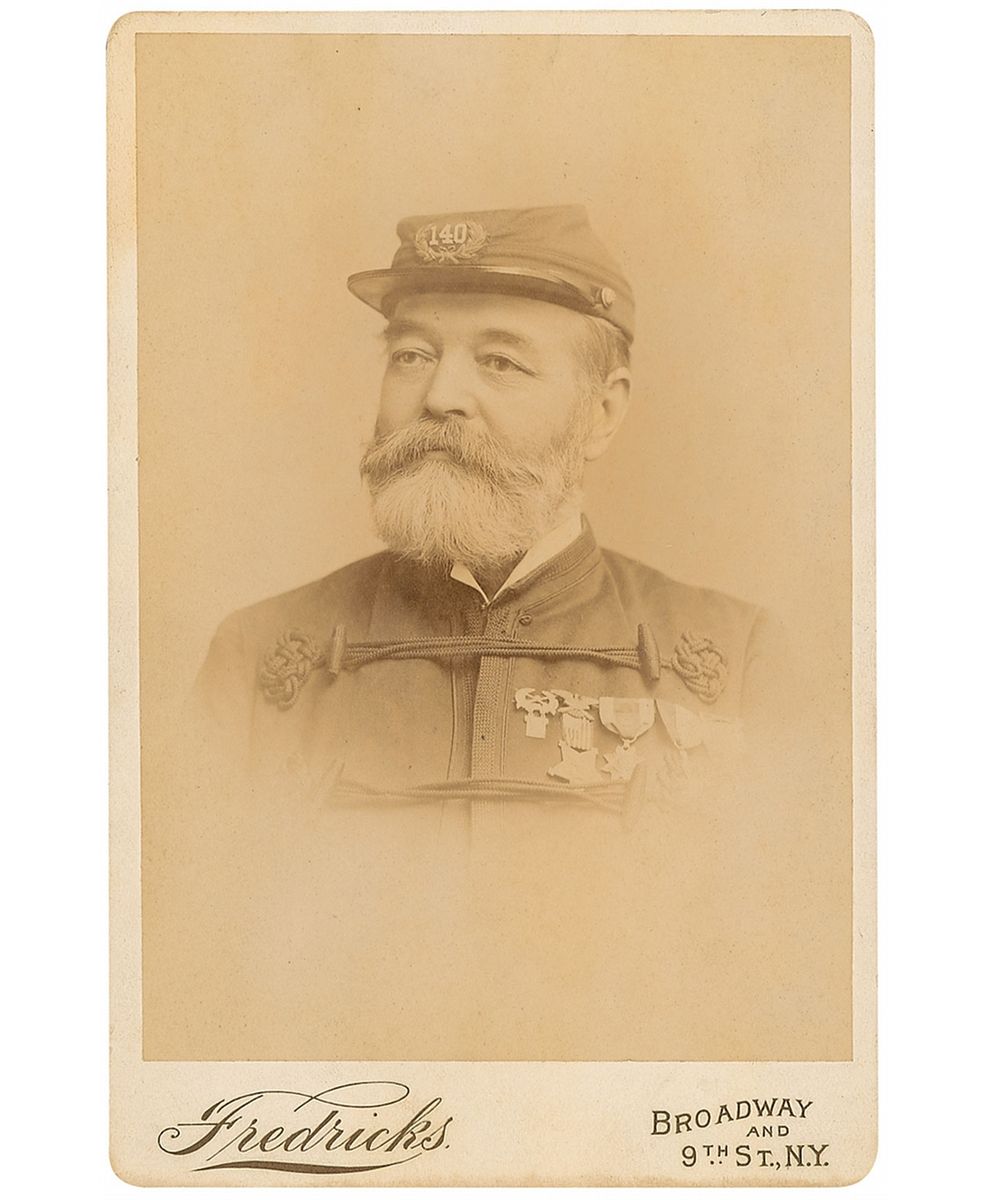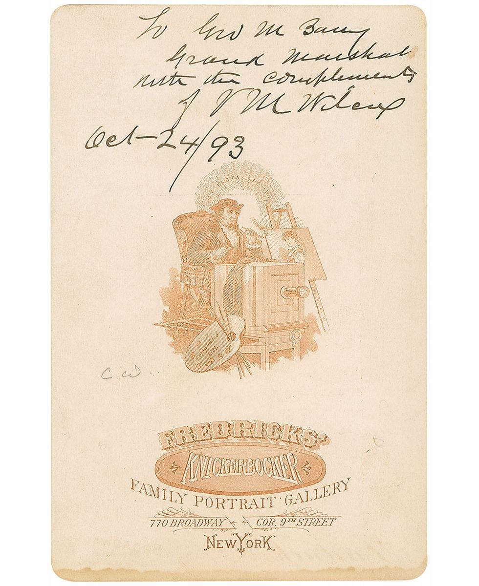 Union colonel in the 132nd Pennsylvania Infantry. Original 4.25 x 6.5 cabinet photo of Wilcox in uniform by Fredricks of New York, signed and inscribed on the reverse in black ink, “To Gen. M. Barry, Grand Marshal, with the compliments of V. M. Wilcox, Oct. 24/93.” Light overall toning and trivial dampstaining to the lower border, otherwise fine condition.