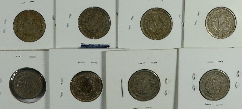 "V" NICKEL LOT: 1912 XF, 1911 XF, 1910 VF, 1909 XF, 1910 F, 1883 NC, 1888 VF