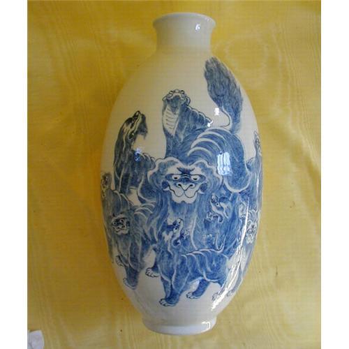 VERY RARE CHINESE PORCELAIN FOO DOGS VASE with seal mark in underglaze blue. The foo dogs well painted in underglaze blue. The vase of ovid form & 14 INCHES TALL. PROVENENCE: PARK BERNET / NYC / 1970'S // VASE IS MINT CONDITION