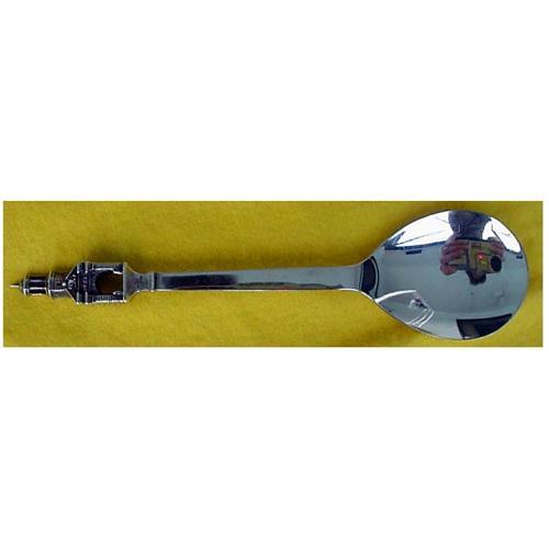 Very rare unusual sterling silver spoon, made in South Africa. Has sculpted openwork model of The Castle (made by Jan Van Riebeeck in Cape Town). Measures 5 3/4" long. Generous, wide bowl, unadorned to show quality of the silver. Sturdy handle, again, quite unadorned. The end however consists of a sculpted model depicting the entrance to The Castle, built by Van Riebeeck in 1652. The back is hallmarked as follows: CM; S925; STG; springbok head; F. The condition is excellent. No damage of any sort.