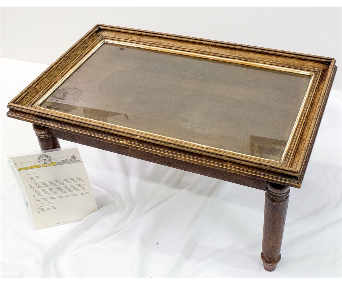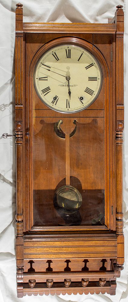 c1872 This is a Seth Thomas Clock that once hung in the V&T Railroad Office in Carson. It measures 36"x 13". It was in operation from 1872 until 1950. Comes with letter. Harris purchased from State of Nevada. Provenance: V&TRR Superindenant Major Sampson to Reno Banker Gordon Harris. A second item is a coffee table, constructed by Sampson out of an old timetable/broadside frame. The story passed on to Harris is that this was one of the leftover frames that were located in each of the V&T stations, holding a timetable or broadside. This table never had one of the broadsides in it. Letter attached from Sampson. Gordon Harris Estate - HKA#65986