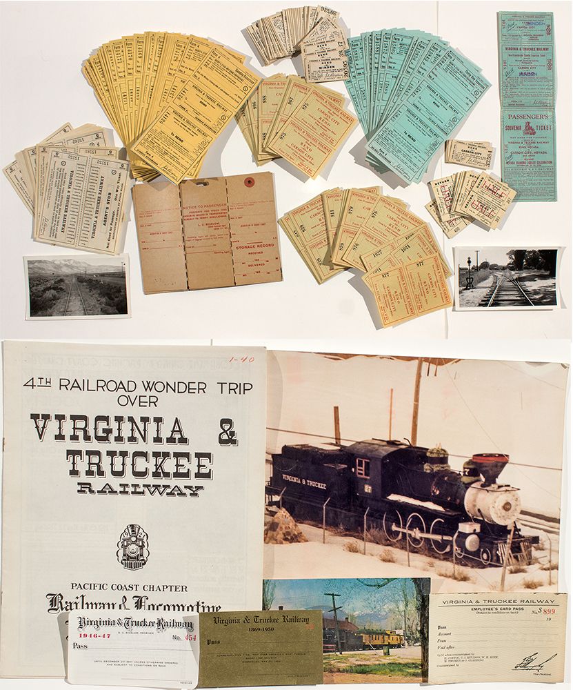 c1900 This is a box containing quite a few (too many to count) unused tickets and passes from the Virginia & Truckee Railway. Several are good form trips between Reno and Minden, others Carson City to Reno. There is also a stack of 30-day excursion tickets. Also included is an old photo of the V&T, a souvenir postcard, an employees pass, and a V&T publication. There are also some baggage tags that are also unused. This is a very attractive lot that is unique and ready to be scooped up by a railroad collector. Provenance: V&TRR Superindenant Major Sampson to Reno Banker Gordon Harris. Gordon Harris Estate - HKA#65485