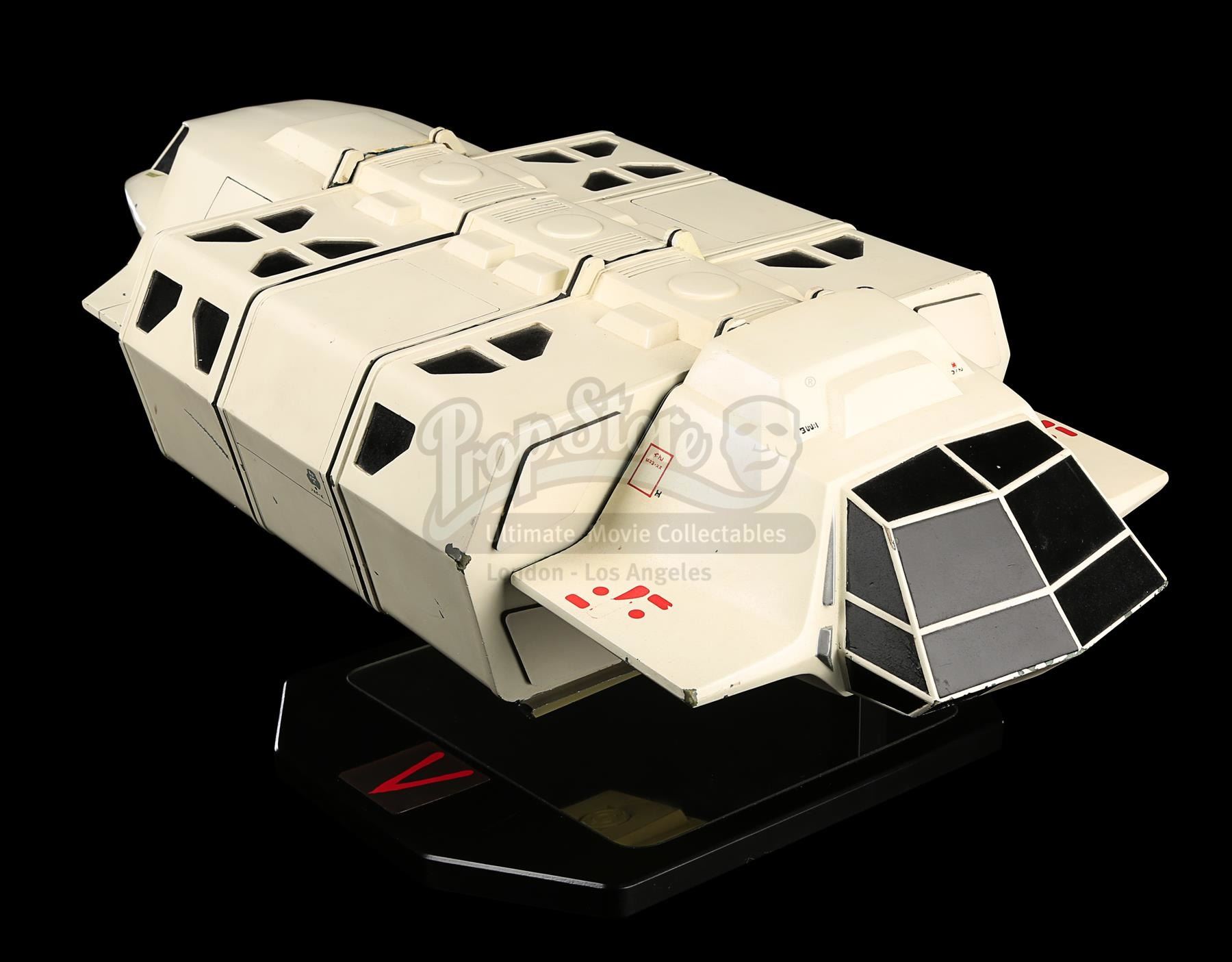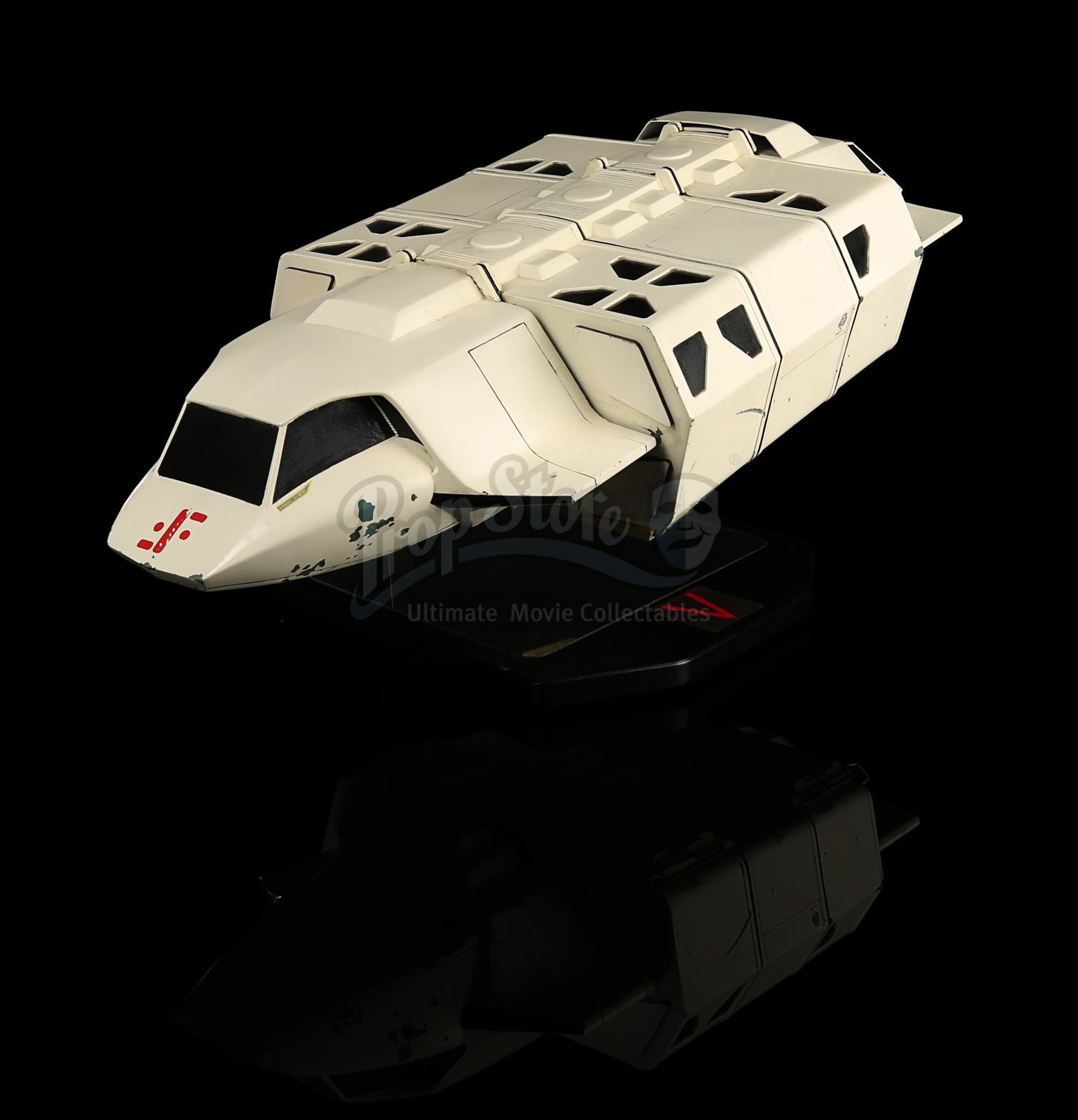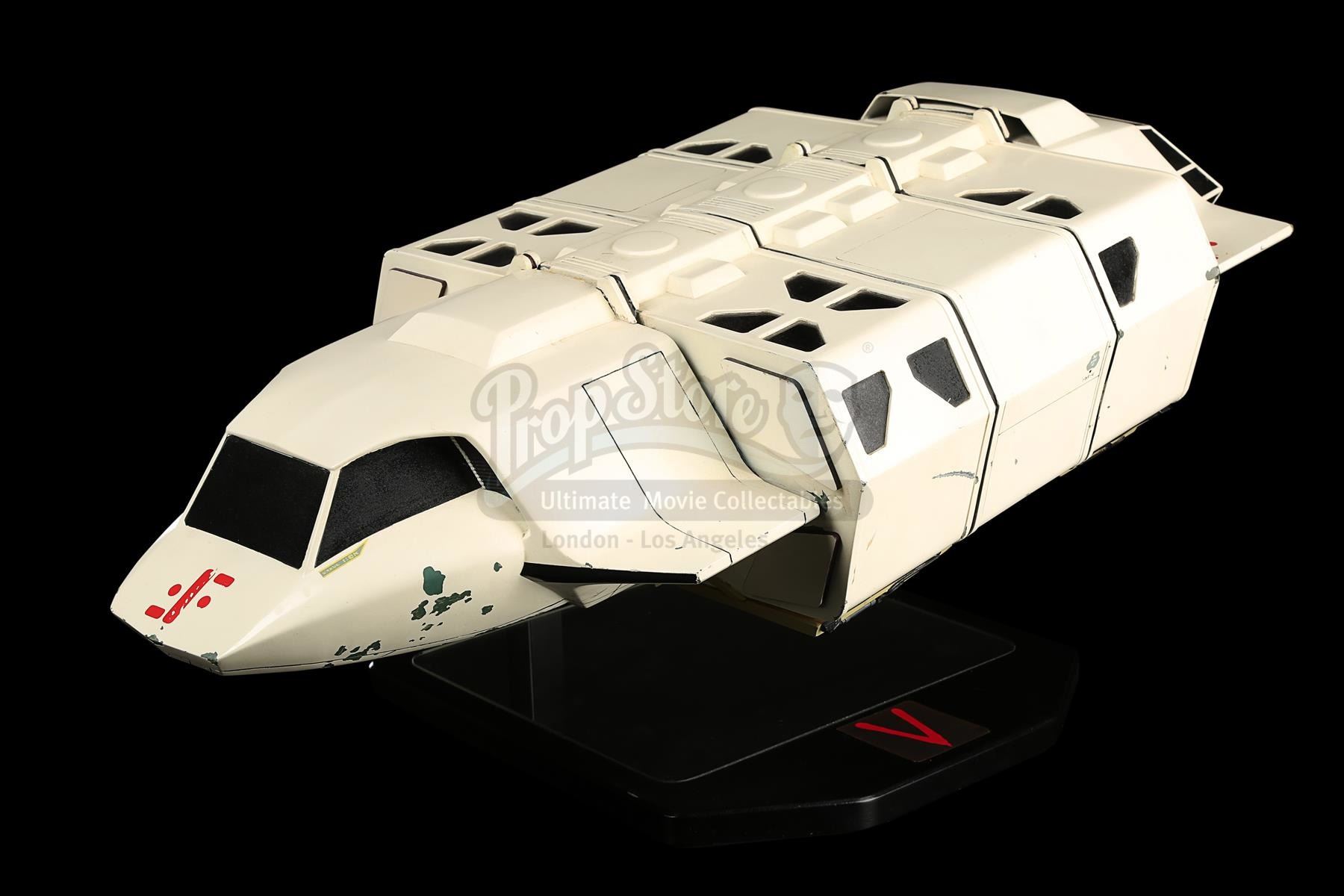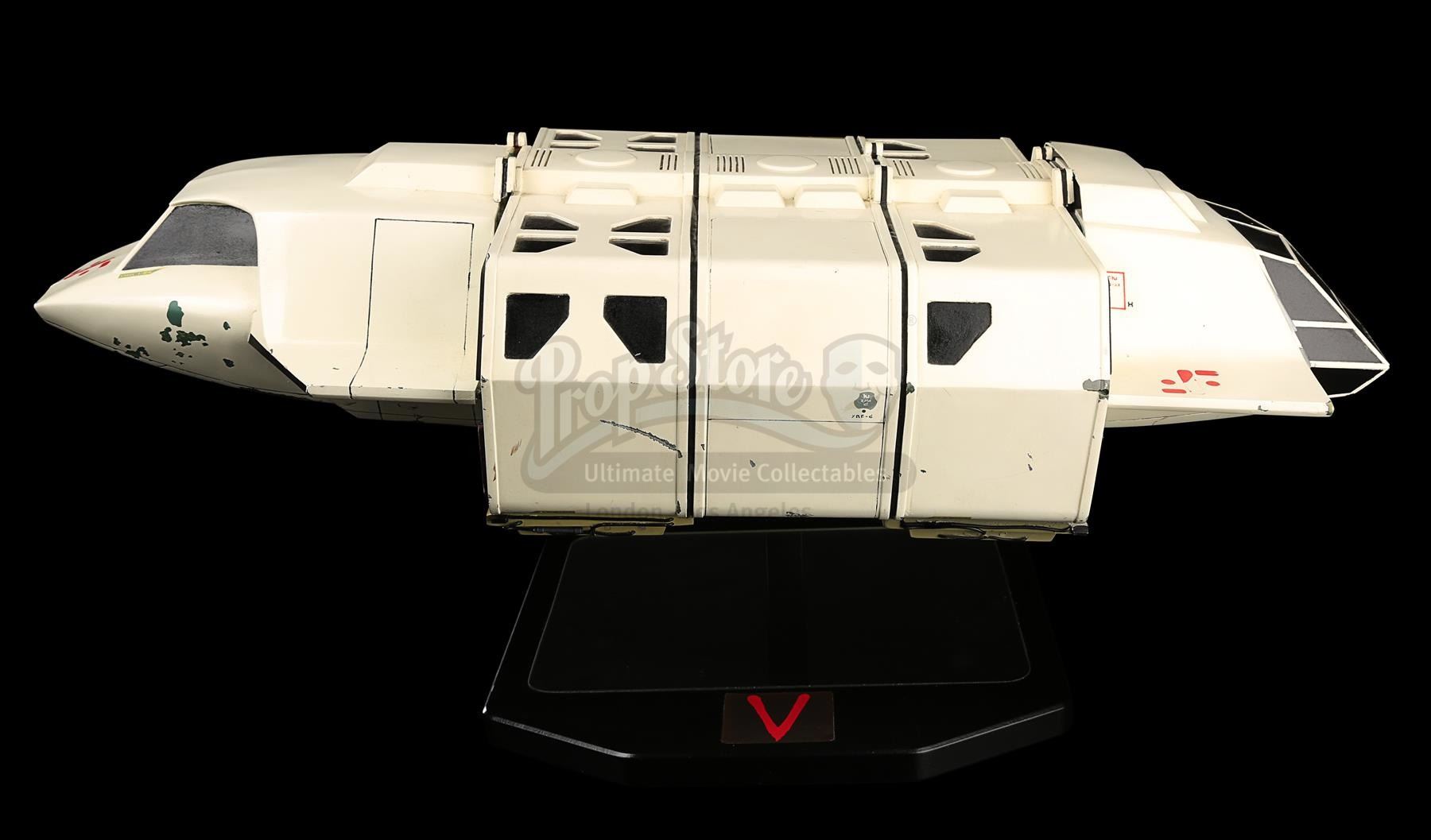 A model miniature squad shuttle from Kenneth Johnson's sci-fi television series V. Squad shuttles were used throughout the series to transport Visitors and supplies from Earth to the Mothership. The numerous shuttles in the series feature a modular design that is evident through all the different vehicle variants.
