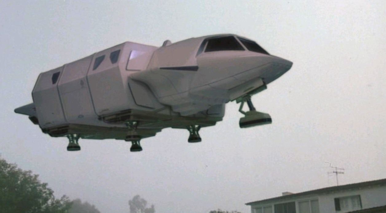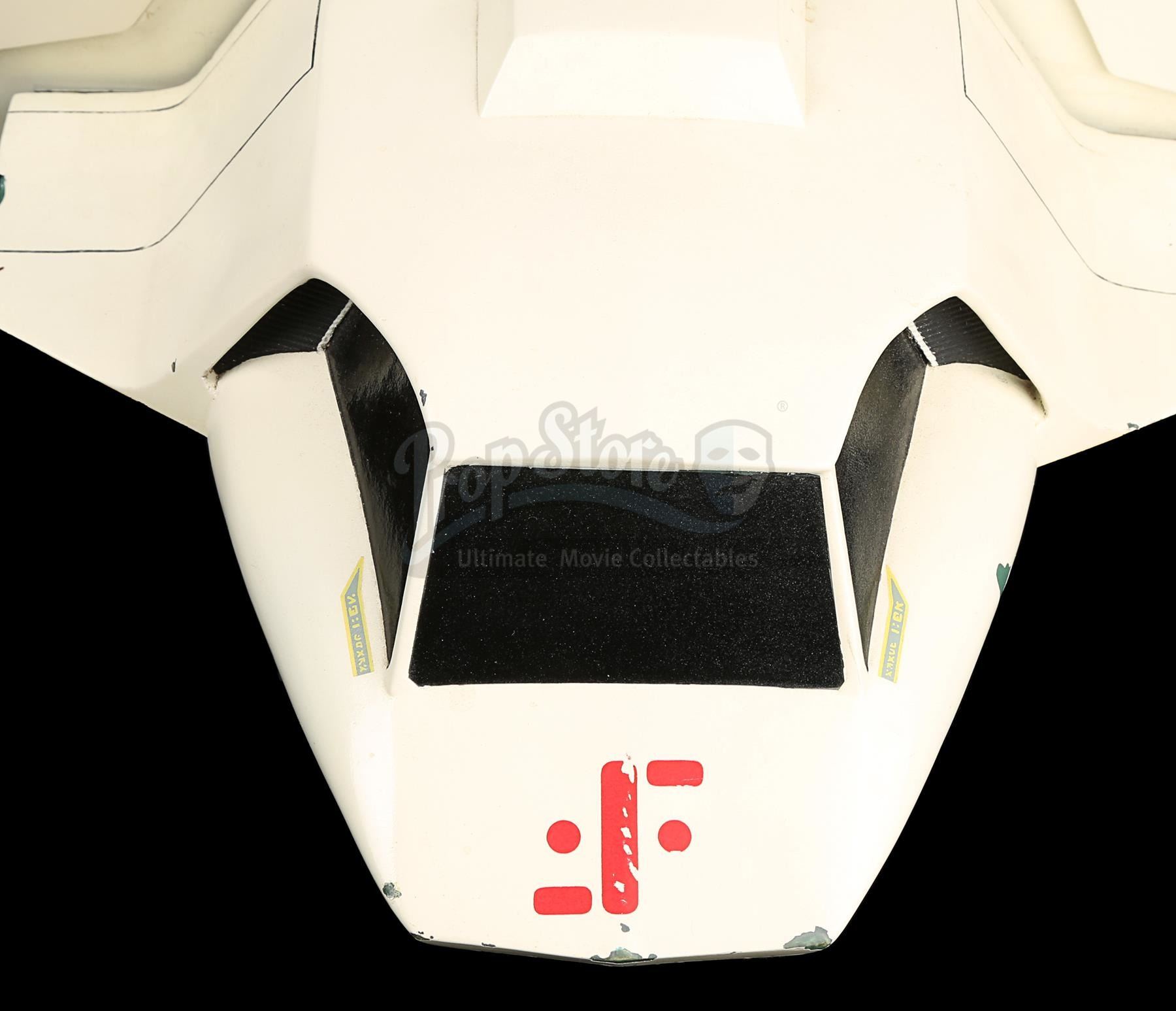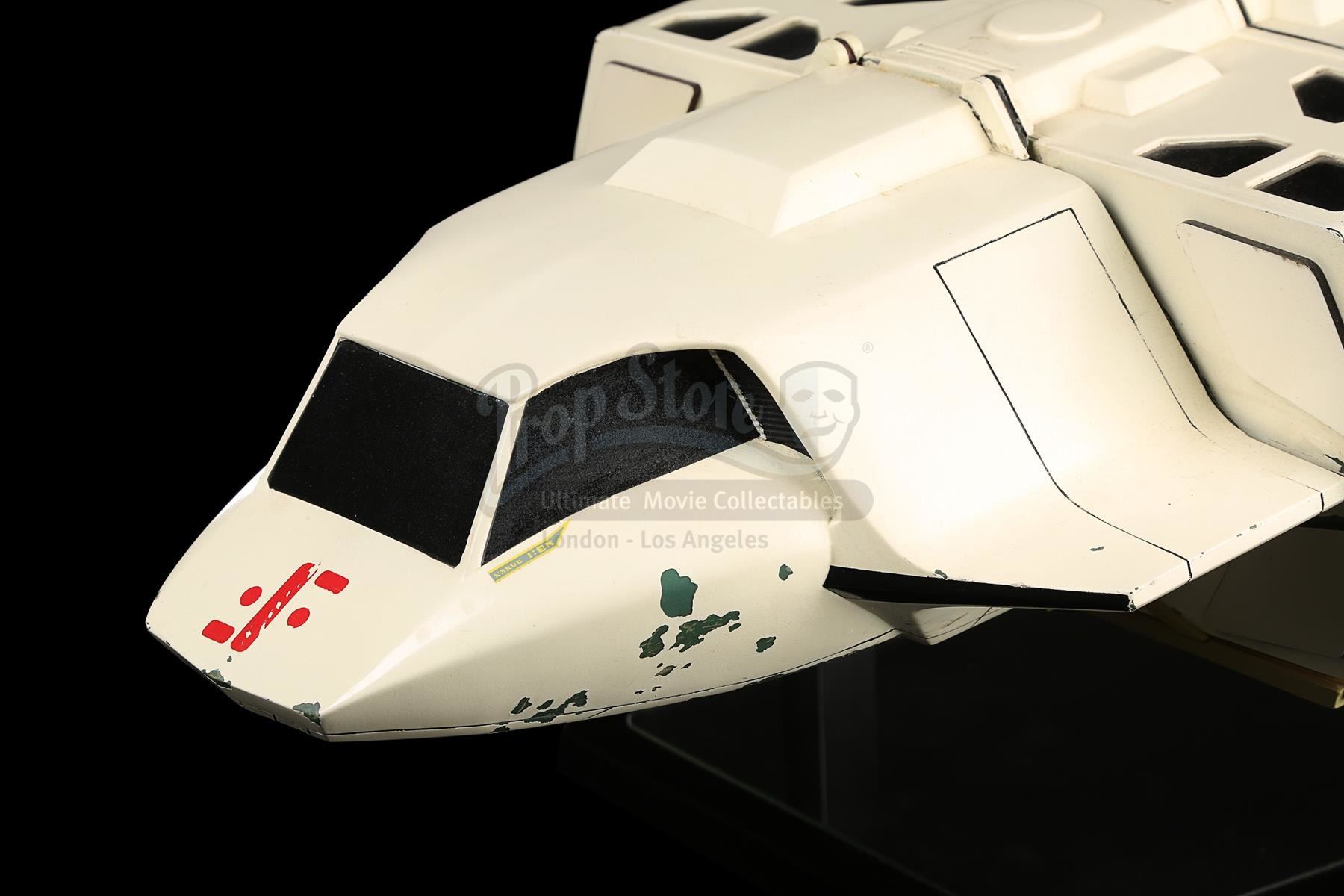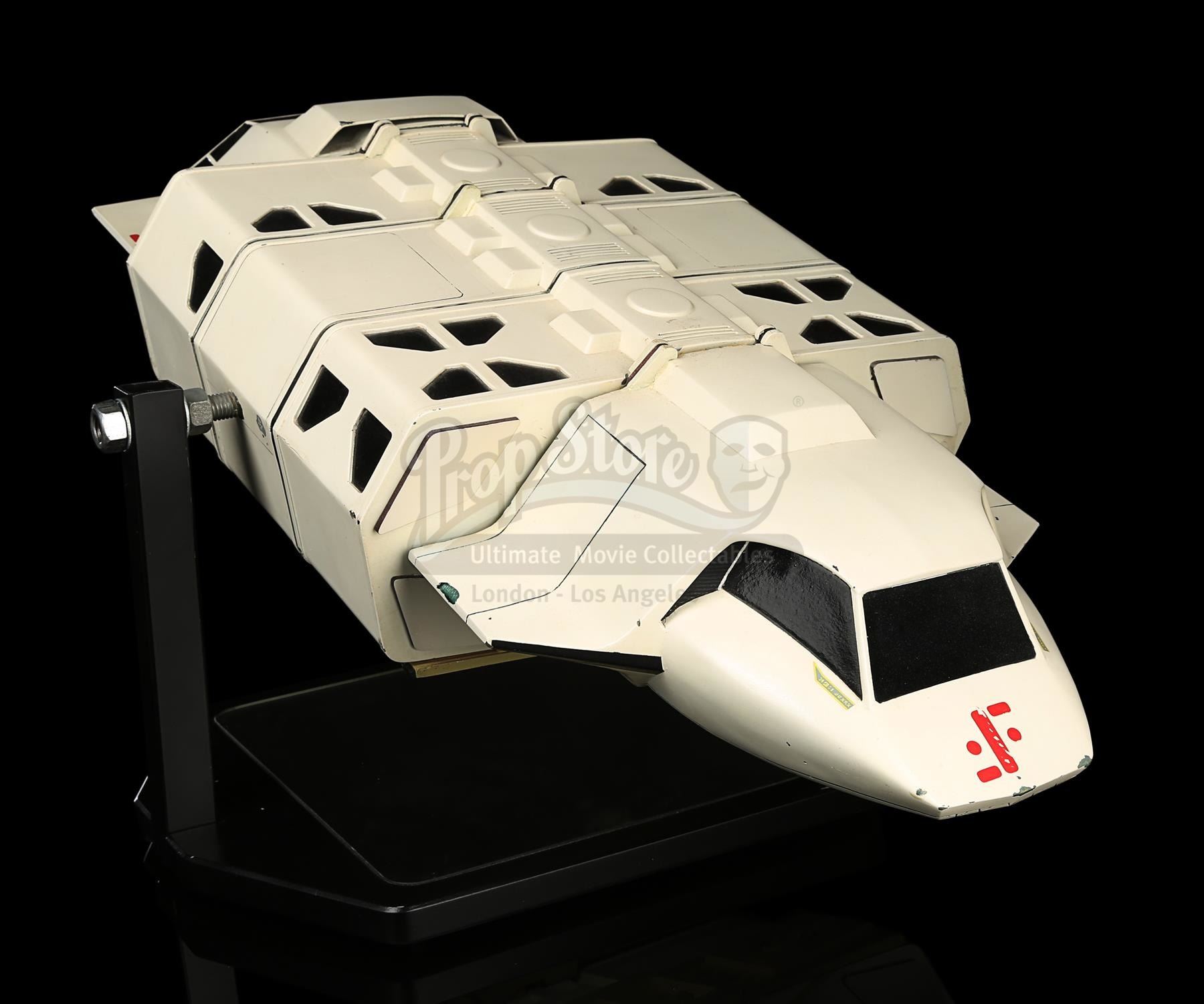 A model miniature squad shuttle from Kenneth Johnson's sci-fi television series V. Squad shuttles were used throughout the series to transport Visitors and supplies from Earth to the Mothership. The numerous shuttles in the series feature a modular design that is evident through all the different vehicle variants.