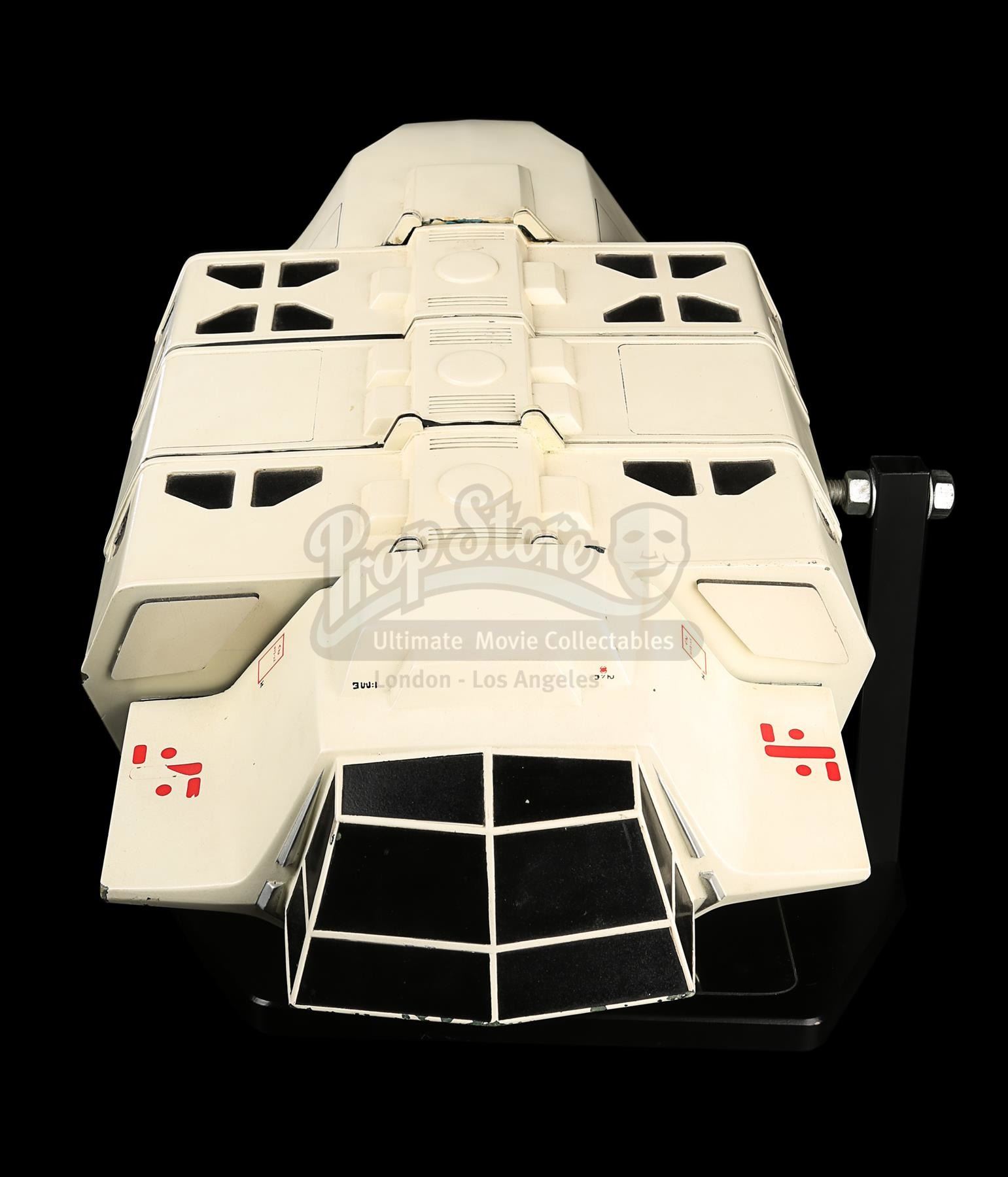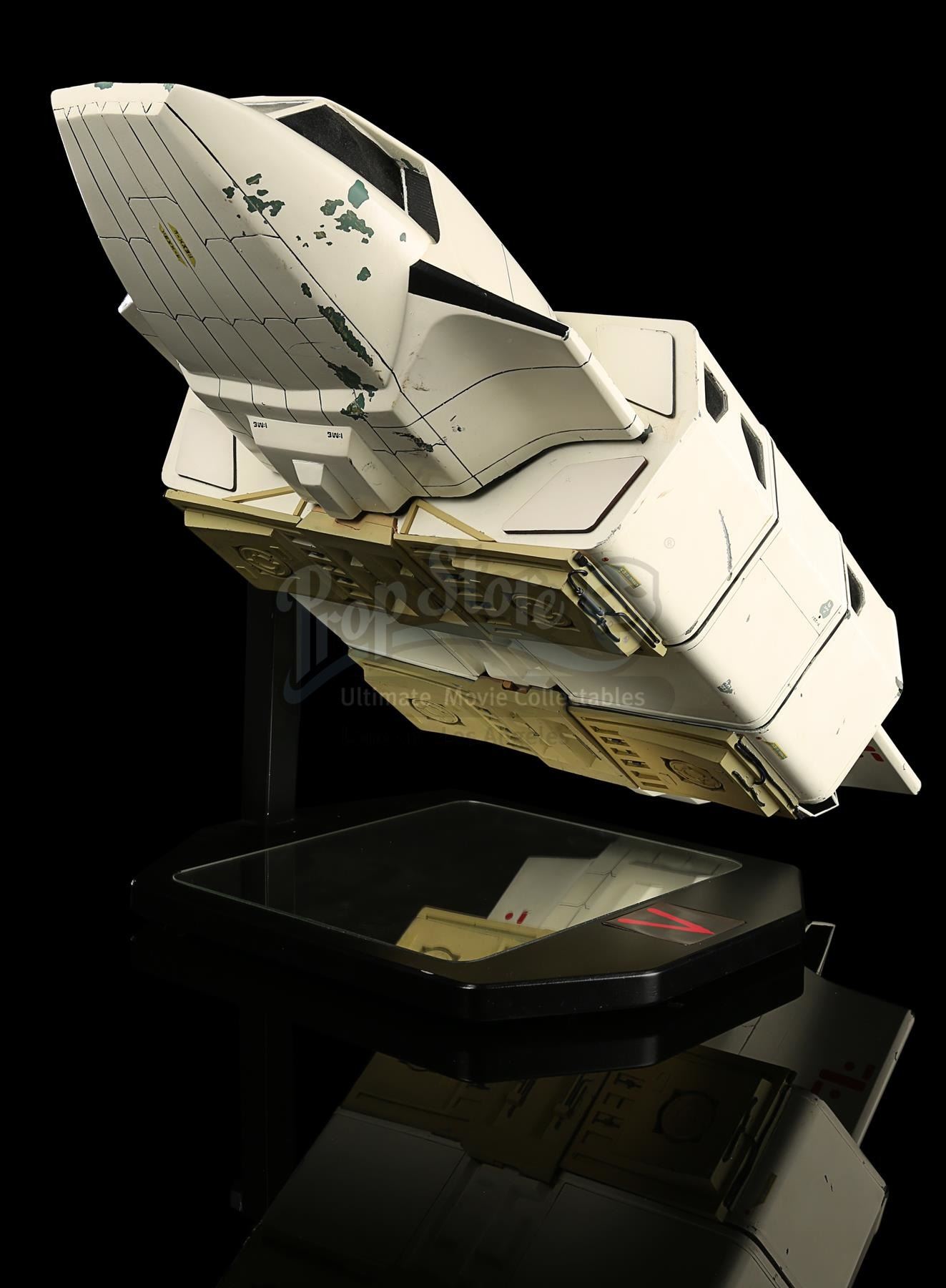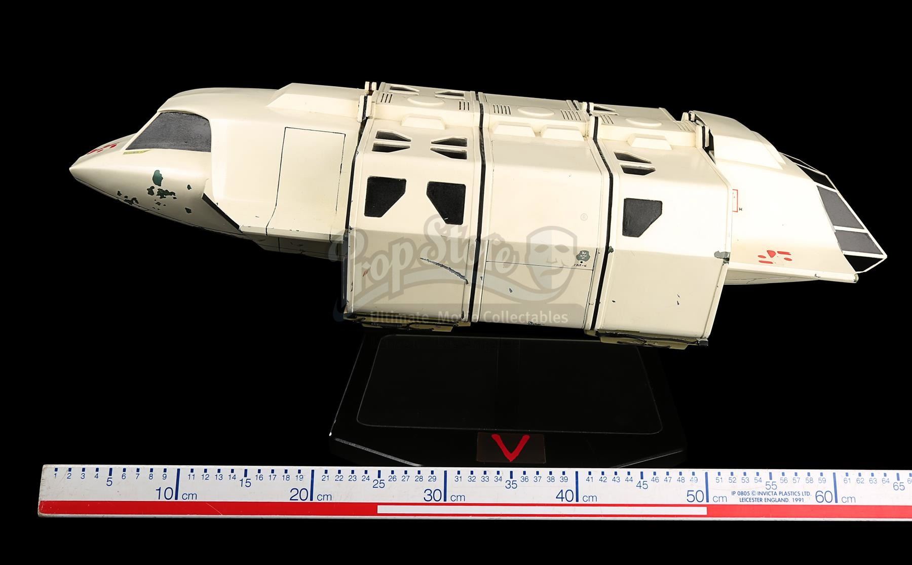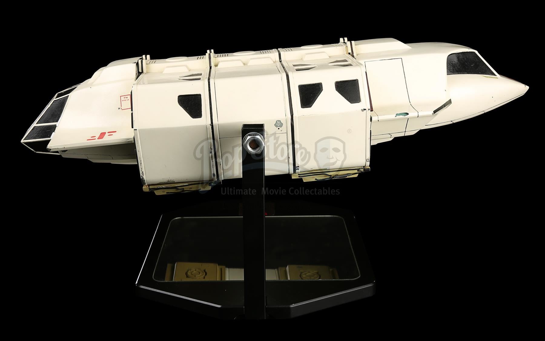 Created by model designer Greg Jein, the miniature is cast in resin and finished in an off-white paint with black windows, red engraved symbols and small vinyl labels. The front and rear of the model resemble a Sky Fighter and the mid-section comprises four cabins. Presented on a black custom-made stand, a mirror reflects its underside revealing details of the vehicle's underside panels, one of which is a replica to complete the model. The piece is mounted on the display by its original filming screw thread rod. Signs of production use and age are evident throughout the main body, including paint wear, cracks and chips. Dimensions: 40 cm x 70 cm x 30 cm (15 3/4'' x 27 1/2'' x 12'')