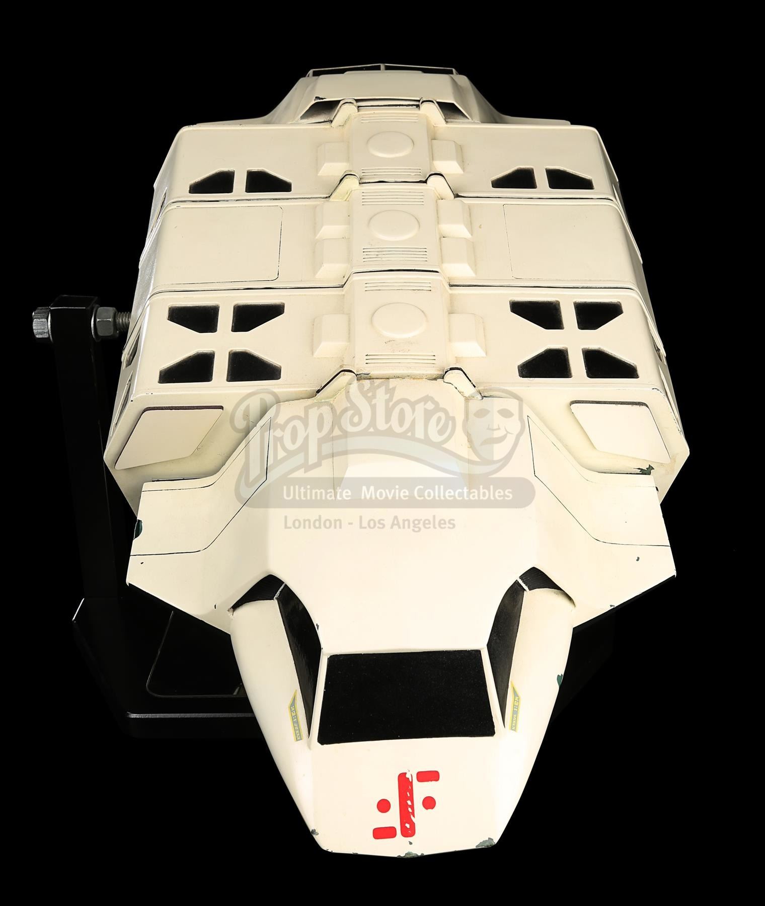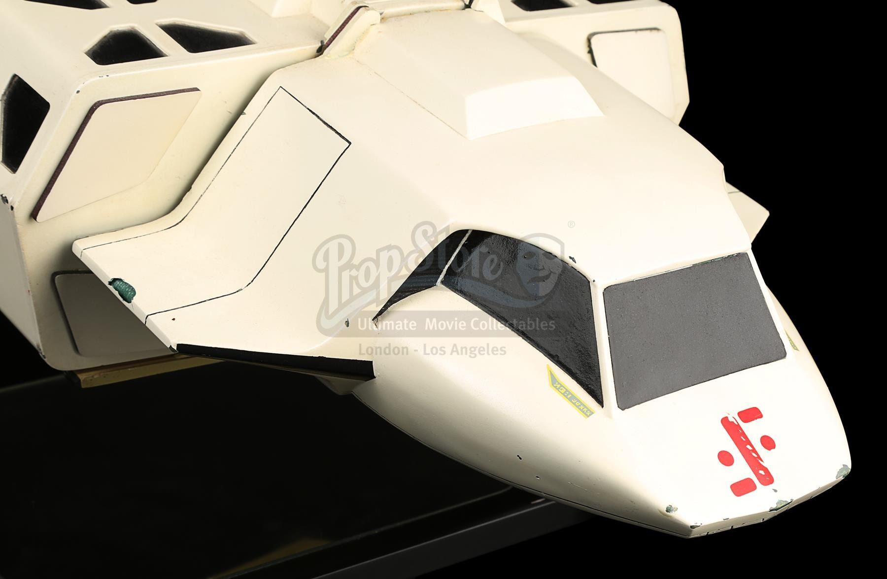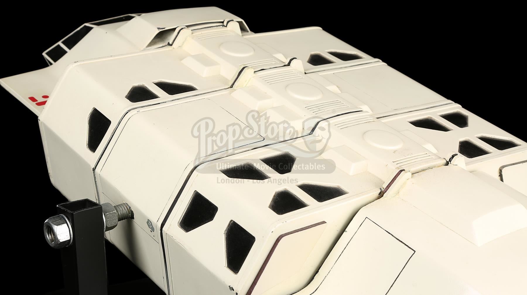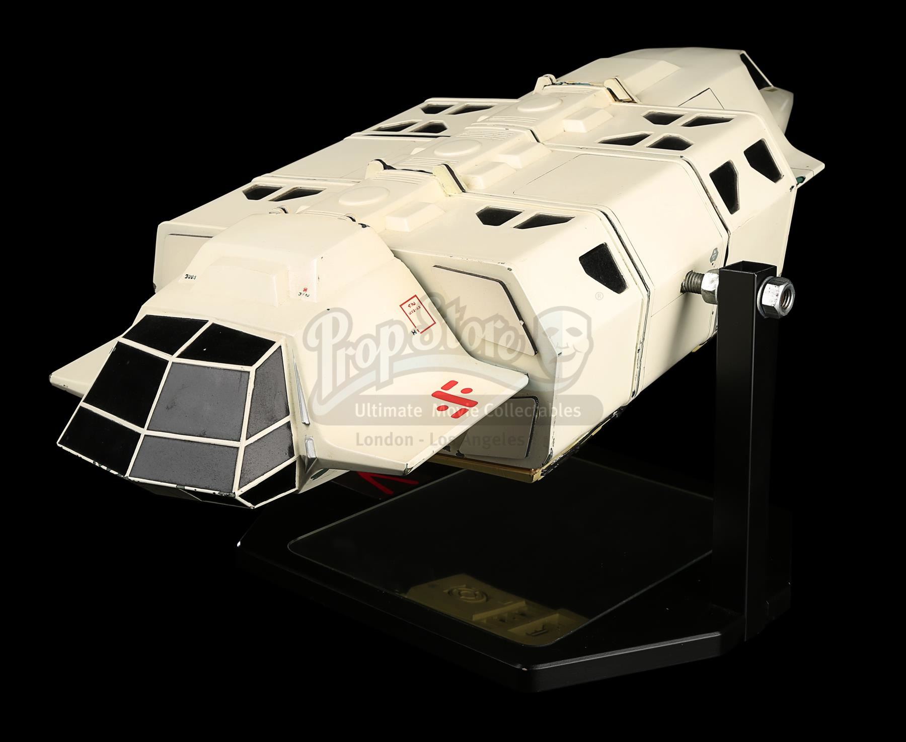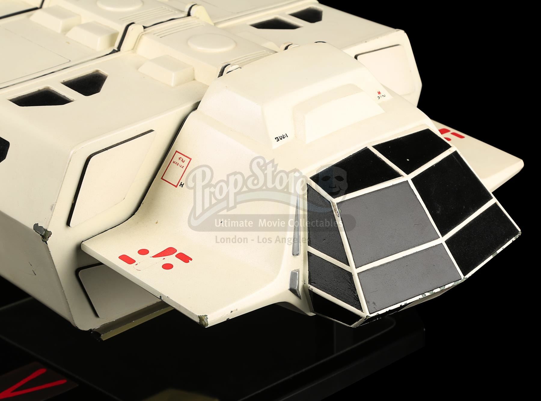 Created by model designer Greg Jein, the miniature is cast in resin and finished in an off-white paint with black windows, red engraved symbols and small vinyl labels. The front and rear of the model resemble a Sky Fighter and the mid-section comprises four cabins. Presented on a black custom-made stand, a mirror reflects its underside revealing details of the vehicle's underside panels, one of which is a replica to complete the model. The piece is mounted on the display by its original filming screw thread rod. Signs of production use and age are evident throughout the main body, including paint wear, cracks and chips. Dimensions: 40 cm x 70 cm x 30 cm (15 3/4'' x 27 1/2'' x 12'')