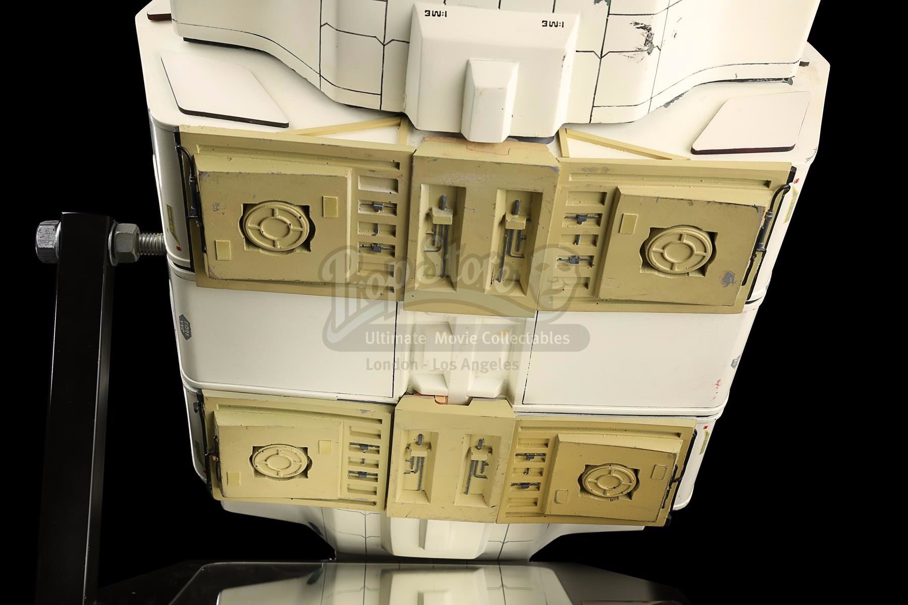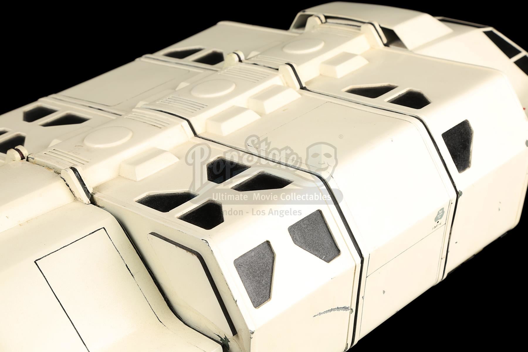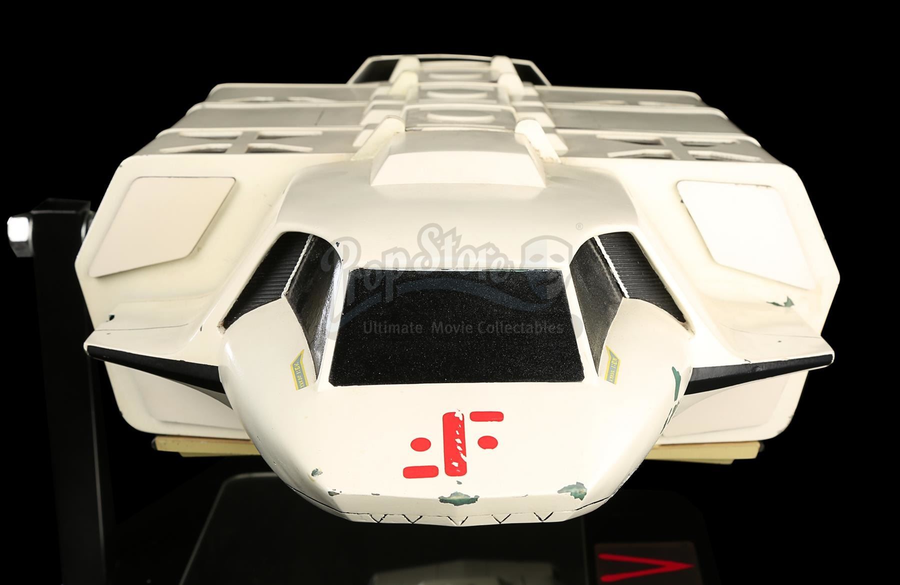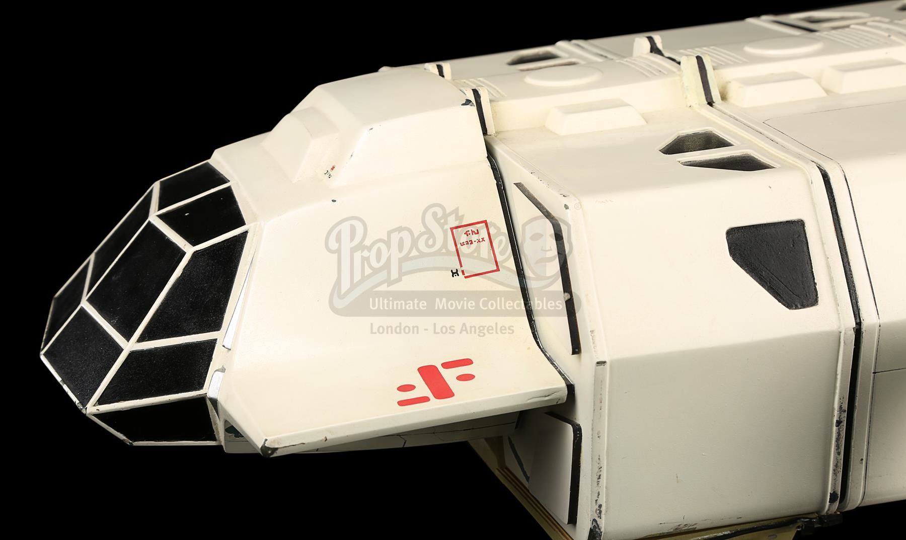 Created by model designer Greg Jein, the miniature is cast in resin and finished in an off-white paint with black windows, red engraved symbols and small vinyl labels. The front and rear of the model resemble a Sky Fighter and the mid-section comprises four cabins. Presented on a black custom-made stand, a mirror reflects its underside revealing details of the vehicle's underside panels, one of which is a replica to complete the model. The piece is mounted on the display by its original filming screw thread rod. Signs of production use and age are evident throughout the main body, including paint wear, cracks and chips. Dimensions: 40 cm x 70 cm x 30 cm (15 3/4'' x 27 1/2'' x 12'')