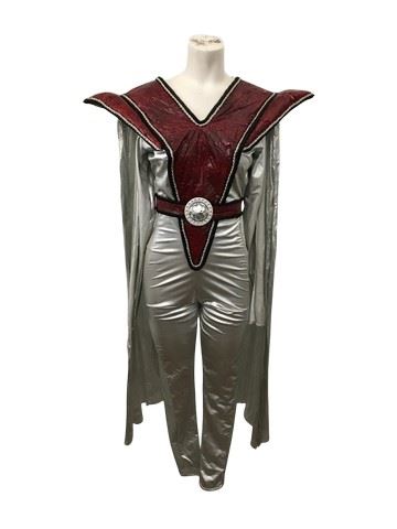 V TV series (1984-1985) -original, custom made, long sleeve silver colored jumpsuit with faux, red and black reptile skin with silver rope trim belted vest.