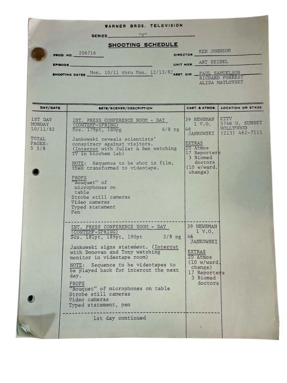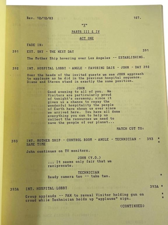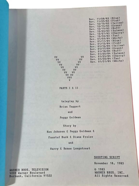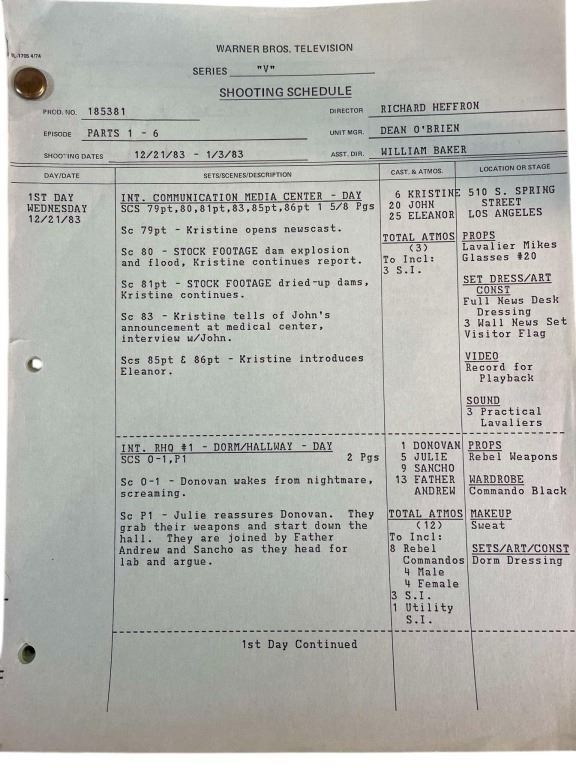 Original set of 3 scripts along with a shooting schedule for the TV miniseries 'V: The Final Battle' (1984), a sequel to the 1983 miniseries V written by Kenneth Johnson about aliens known as "The Visitors" trying to take over Earth.