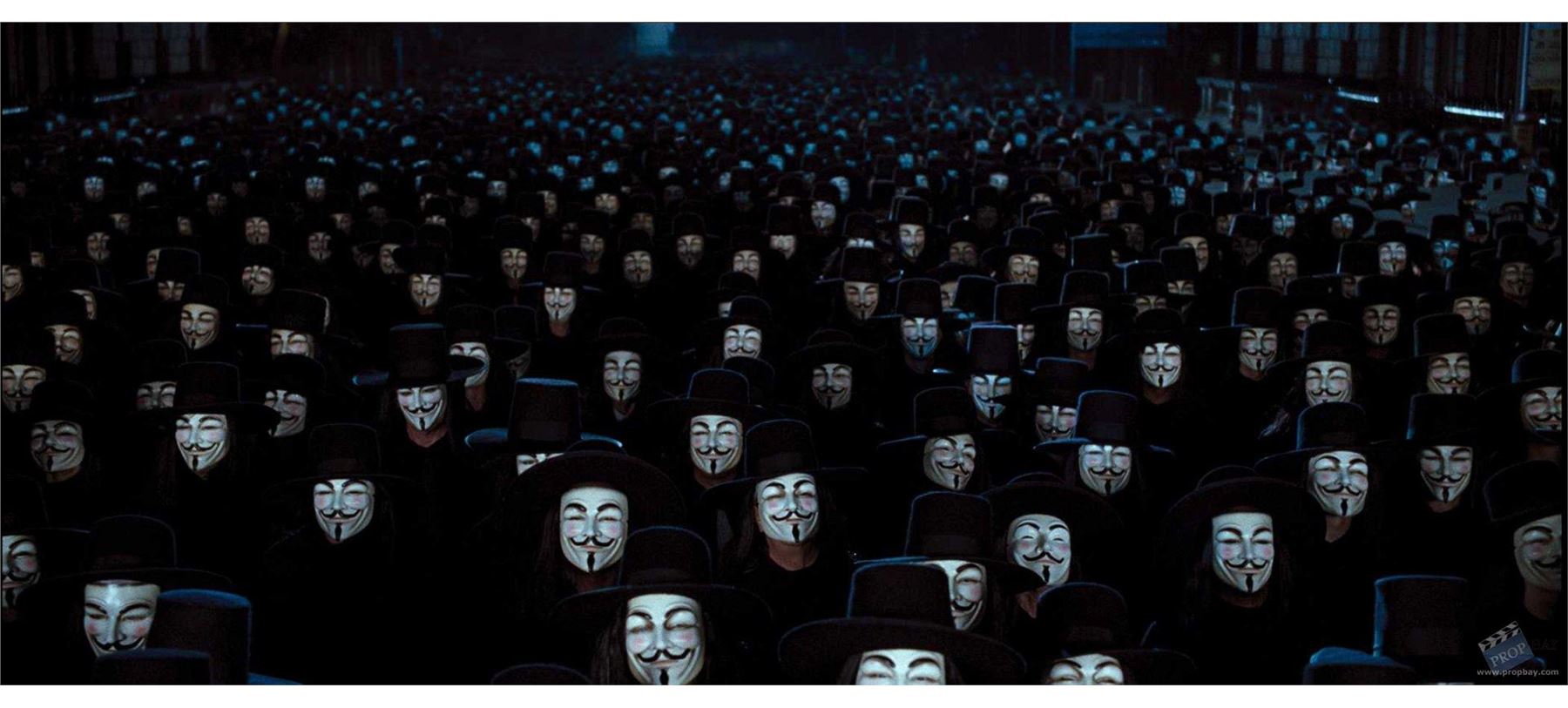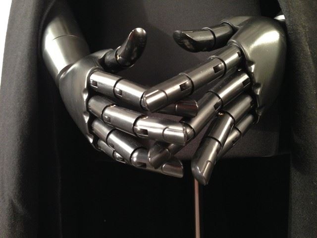 V for Vendetta (2005) - This is a very rare screen used hero custom made complete costume with mannequin, including black 'Puritan style' hat with satin ribbon and hair piece attached, heavy cloth black cloak, and infamous plastic mask with elastic band with padding inside for comfort while shooting on set. Includes a black mannequin with metal stand, arms and hands with movable joints, and head piece. Comes with a certificate of authenticity from Warner Bros and inside is labeled #77 for the actor who appeared in the film in the end crowd scene. Acquired as a complete costume with immaculate display.