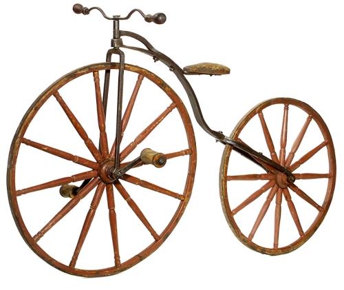 Vélocipède, um 1865 "Michaux"-Typ-Tretkurbelfahrrad mit Frontantrieb. Hersteller: Olav Olsson (1819–1867), Landafors/ Schweden. Schmiedeeiserner Rahmen, Holzspeichenräder mit Bereifung aus Eisenringen (Ø vorne 93 cm – hinten 78 cm), Holzsattel, Handgriffe erneuert, originale rote Farbe! – Ein echtes Museumsstück! Early "Boneshaker" Bicycle "Michaux"-type bicycle, made by "Olav Olsson, Sweden", diagonal iron frame, wooden spokewheels with iron tires (Ø front 36 2/3 in. – rear 30 3/4 in.), wooden saddle, replaced handles, with original red color. – A fascinating museum exhibit! – (3–4/3) – € 3.200/5.000 – (317/6)