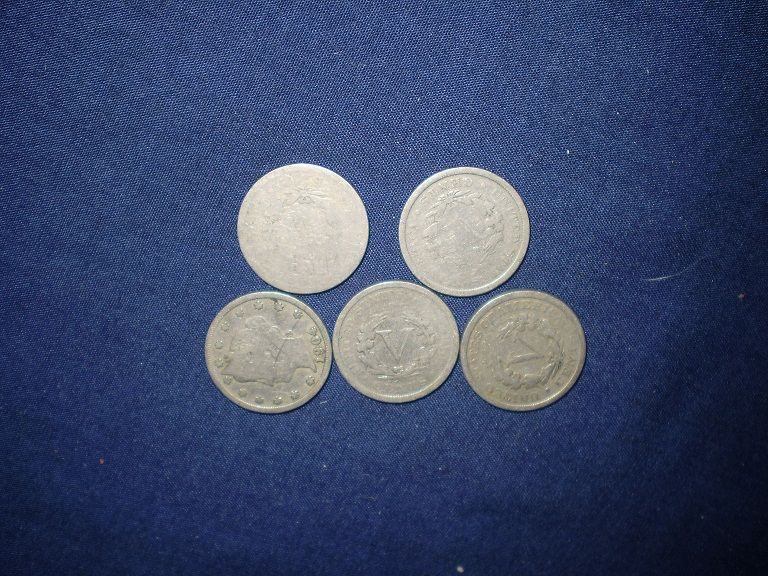 5 v nickles dated 1900,1902,1904,1904 and 1911 vg+