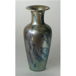 Fehércserép, korongozott forma, felületén savmaratott, fémes fényu márványozott eozinmázakkal festett. Jelzett: bélyegzett márkajelzés, Zsolnay, Pécs XX. sz. eleje, M.: 27 cm