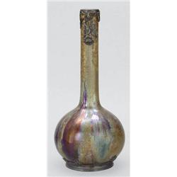 1900 körül, eozinmázas fajansz, nyakán és talpán ezüst rátétekkel, restaurált jelzett az alján: Clement Golfe és Kassier Juan (A.M.), m: 29,5 cm, restaurált