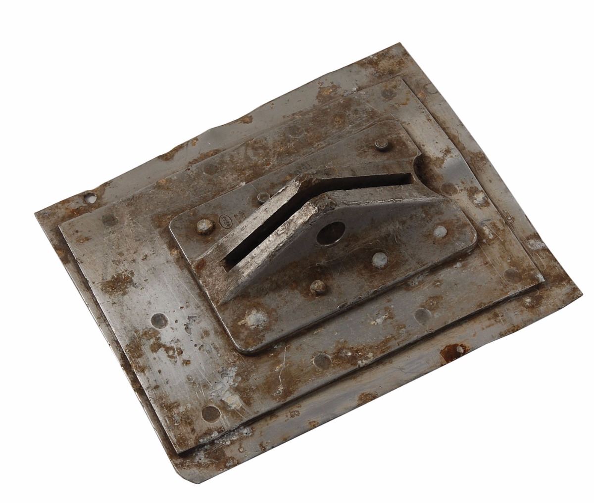German V2 rocket tank holder and injection valves: the tank holder measures approximately 6 x 7.25 and the five injection valves are each about .75? in diameter. Several other metal fragments are included. In overall very good condition, with expected rust and damage.