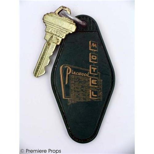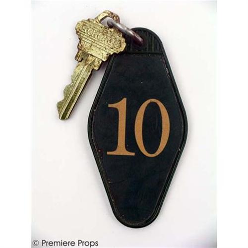 VACANCY - Pinewood Motel room # 10 key. Gold key with a green plastic key chain with orange-ish yellow graphic of motel sign and room number. (*Bloody and dirty)(Key chain is approx. 3.5" x 1.75"). (VAC2012)