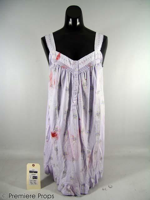 This screen worn outfit comes with a blood stained floral print night gown, silver half loop multi diamond earrings (*Earrings do not match) (Approx. 1/2"), a silver multi diamond wedding ring!