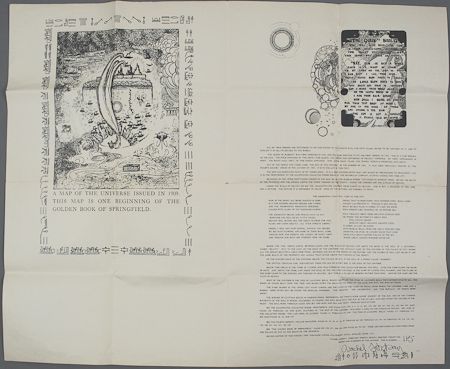(1879 - 1931) American poet who tramped throughout the South trading his poetry for room and board, influencing the revival of oral poetry as an art form. A most interesting and attractive item, a large poster measuring 34" x 27" b/w, showing an illustrated "Map of the Universe Issues in 1909", and his poem "The Queen of Bubbles", with text beneath reading: "All my true friends are petitioned to pin this poster on the parlour wall for fifty years never to be ashamed of it, and to explain in all its details to the world. 'The Queen of Bubbles' was first published in 1904, and the verse written to fit the first design...", with more fine content explaining the linking of the map and the poem. Signed at bottom right and numbered "115" in his hand above a line of fanciful hieroglyphics. Folds, a small central hole, else in very good condition.
