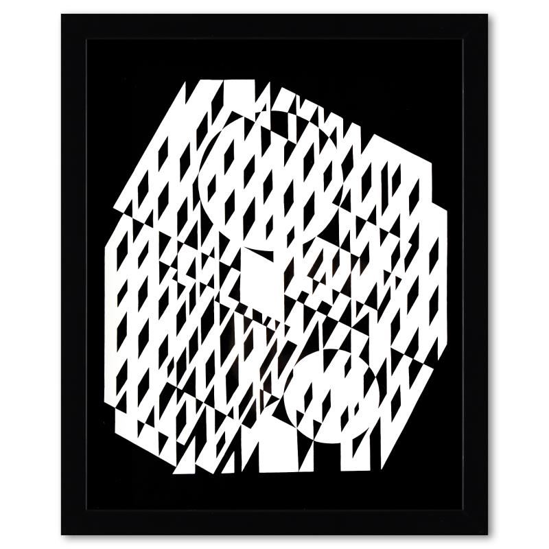 "VAH-NEG et Nethe de la serie Croises (Diptych)" is a set of heliogravure prints on paper, published in 1973, by Victor Vasarely (1908-1997). These pieces come custom framed, with a letter of authenticity and with a 1976 Vasarely paperback. Measures approx. 12.5" x 15" (frame), 10" x 13" (image).