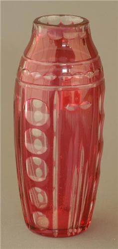 VAL ST. LAMBERT CRANBERRY CUT TO CLEAR GLASS VASE geometric pattern, unsigned, 7" high