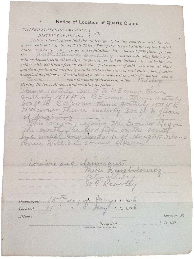 VALDEZ, ALASKA,CLAIM NOTICE DATED 1906: Hard Rock Quartz Claim , called the North Extension Ground Hog, located in the Valdez Mining District, Alaska, dated 1906.