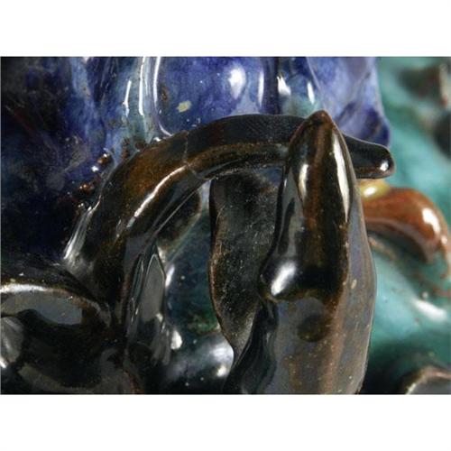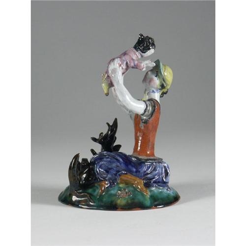 FAIENCE: Tin-glazed earthenware figure group for the Wiener Werkstatte depicting a seated mother with child held aloft; impressed 'Made in Austria', Wiener Werkstatte cipher and '839 3' at underside. Attributable to Vally Weiselthier. Note repair. 7.75'' H