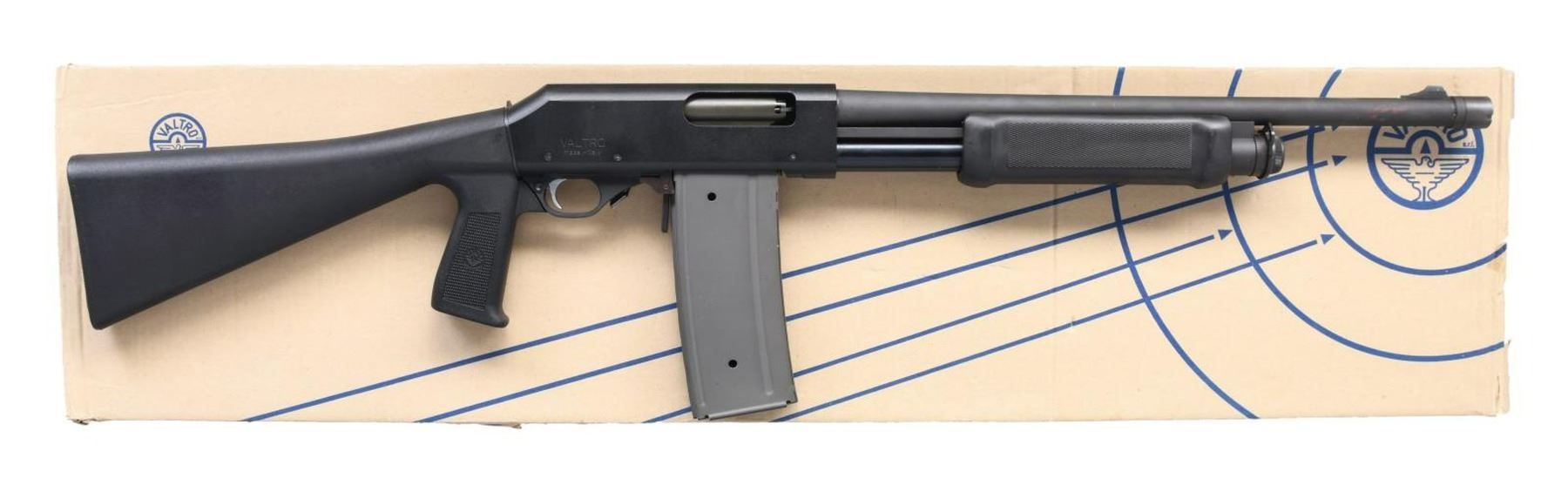 Cal. 12 Ga. 3". S# P09354. Bbl. 20". Ramped blade front sight. Italian-made pump-action shotgun that takes detachable box mags. Parkerized finish. Checkered black pistol grip & forend. MAGS: 2–7 rd. detachable. UNATTACHED ACCESSORIES: matching-numbered factory box with manual. CONDITION: all aspects are near excellent with some light operational wear. PROVENANCE: from the Lifelong Collection of Terrance McCarty. (24-500/MJC). MODERN. $500-800.