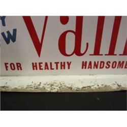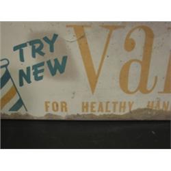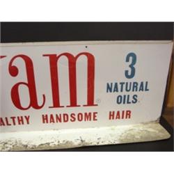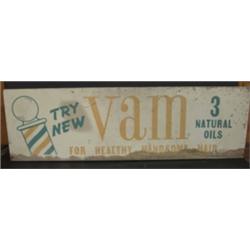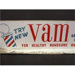 VAM BARBER ADVERTISING DISPLAY. Table-top advertising display sign reads “Try New Vam For Healthy Handsome Hair, 3 Natural Oils” on both sides. Shows water damage to bottom. Shows signs of wear. 9” H, 28” L