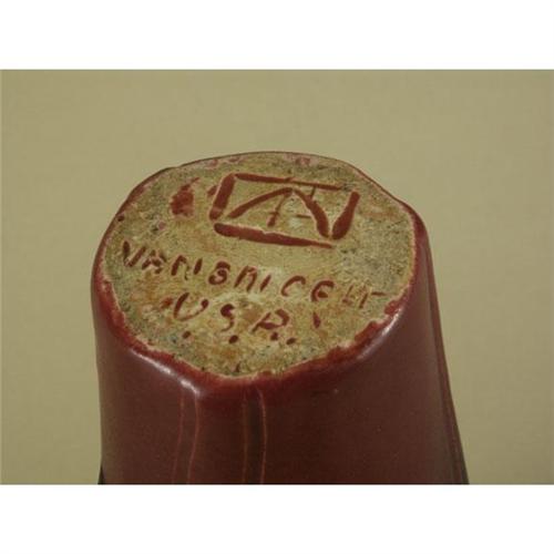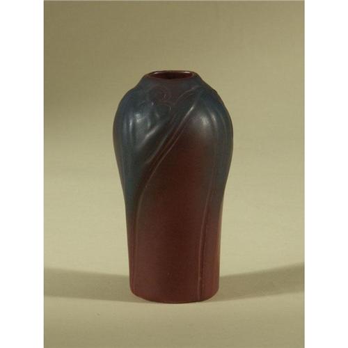 ART POTTERY: Van Briggle art pottery cabinet vase, dark mulberry glaze with blue overspray, vase #833, impressed hallmark and ''Van Briggle, USA'' on underside, stylized flower motif, no chips, cracks or repairs, one lighter discolored glaze spot noted, 5.5'' x 2.5'', late teens.