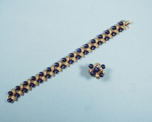 VAN CLEEF & ARPELS - A French 18 kt. yellow gold and lapis lazuli bracelet and matching cocktail ring. Designed as a sequence of alternating small leaves and round blue lapis berries. Fully marked and signed. Circa 1950.
