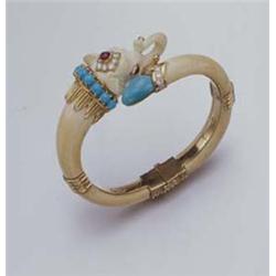 VAN CLEEF & ARPELS AN IVORY AND MULTI-GEM ELEPHANT'S HEAD BANGLE the hinged bangle ,of crossover design, modeled as a carved ivory elephant head enhanced with ruby, diamond, turquoise and 18K fluted gold decorations and emerald eyes, with a turquoise and diamond terminal, inner diameter 21/2 inches signed van cleef & arpels, No. ny44016 $3,000-4,000