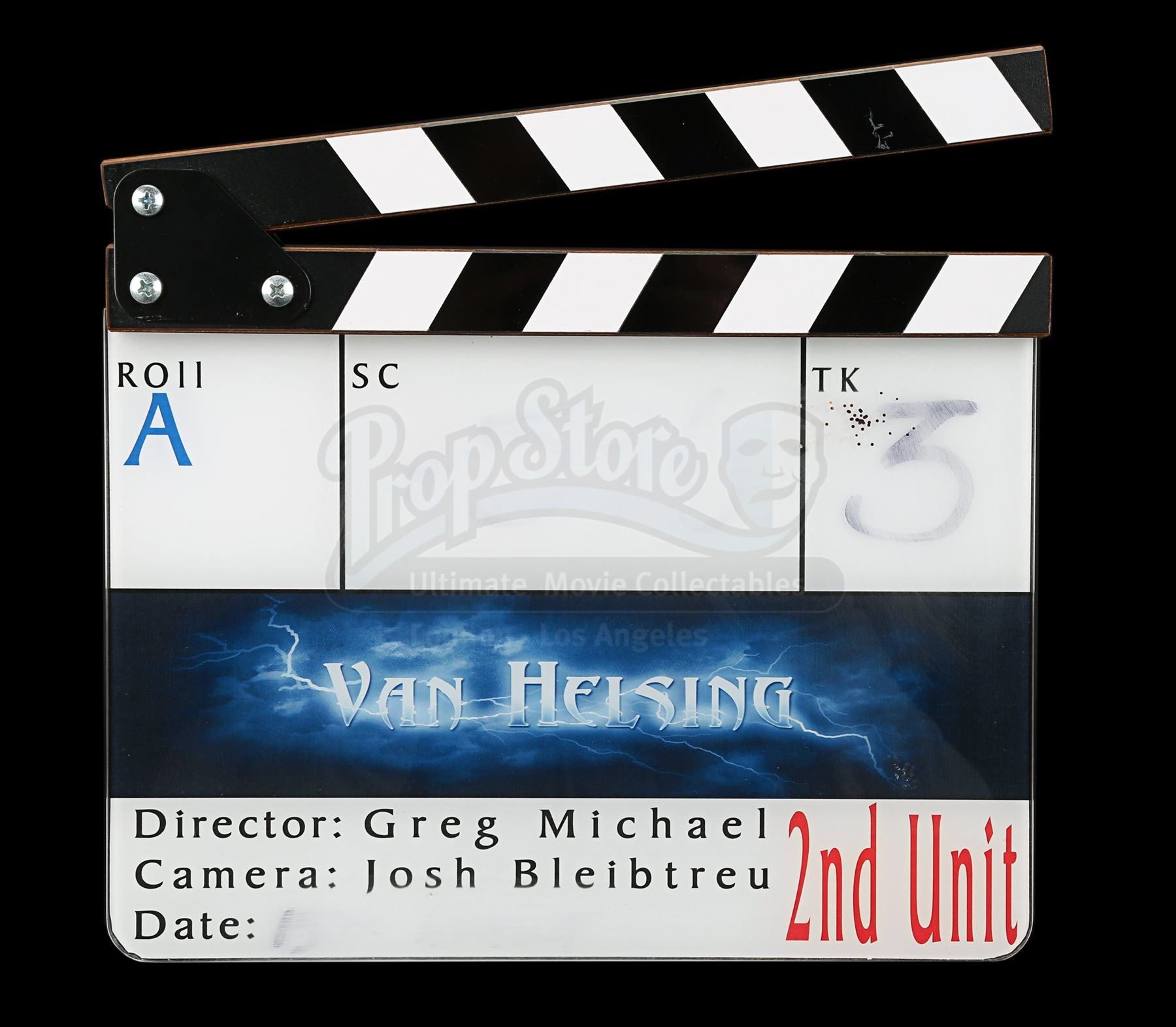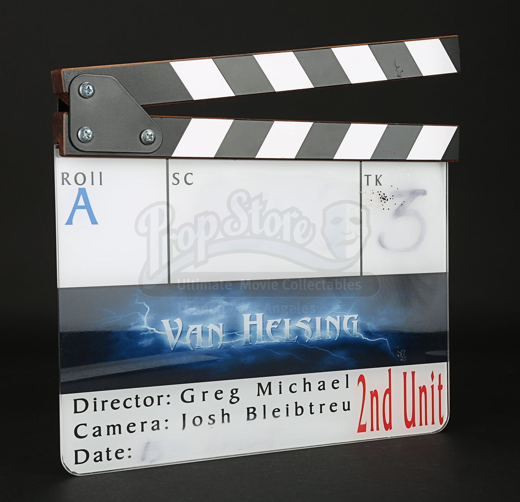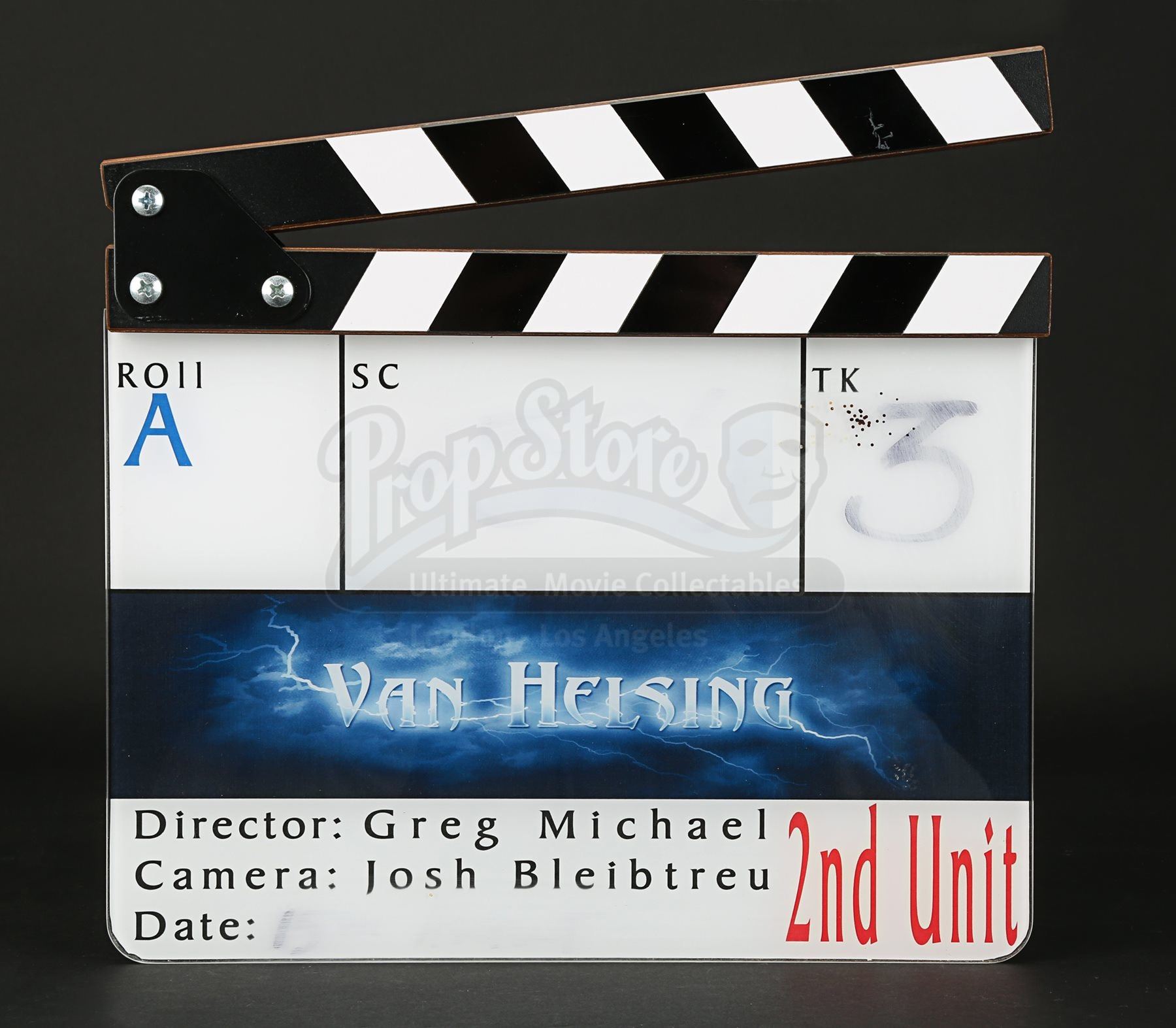 A 2nd unit clapperboard crew gift from Stephen Sommers’ fantasy adventure film Van Helsing. The clapperboard consists of an acrylic slate with a wooden clapper. The slate is backed with vinyl, on which are printed boxes for information, including roll, scene, date and take. The movie title is incorporated into a lightning-themed banner above the second unit director “Greg Michael”, camera “Josh Bleibtreu” and “2nd Unit” in red. Unused during production, the slate has some ink residue from where fields were filled in for aesthetic purposes. Dimensions: 3 cm x 28 cm x 24 cm (1 ¼” x 11” x 9 ½”)
